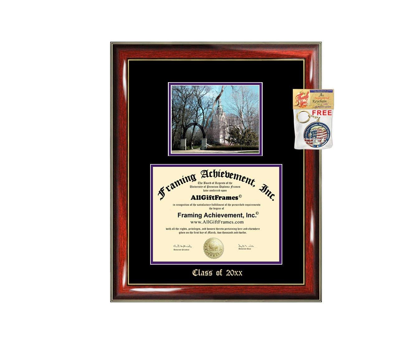 Custom Emboss quality large Northwestern University degree frames and certificate frames with school campus photo using state-of-the-art quality control techniques to display achievement. Selling a variety of matted personalized embossing elite wood custom college university Northwestern diploma frames with campus photo image. All certificate frames are custom made to fit your diploma document sizes. Northwestern University diploma frame campus school photo with school image picture college picture image as a graduation gift that showcase a beautiful unique degree or certificate degree plaque. These graduation Northwestern custom diploma frames can display professional certifications and degrees with a campus image. This diploma frame holder case features a beautiful Engraved Document Plaque Glossy Prestige Mahogany with Gold Accents Wood Moulding Graduate Plaque Frame Gift and school photo. This eye-catching stunning Northwestern University diploma frame makes it a unique graduation gift idea for law school, college, university, engineering, medical school, dental school, nursing graduates etc.. After you place your order, email us through AchievementGifts (Amazon) or AllGiftFrames and let us know your "diploma size," Includes Double-matting Top mat (Black) Inner matted (Purple), backboard, pH balance matboards help preserve and protect your diploma, glass and hanging hardware. All certificate college frames are custom made to fit your diploma sizes. Vast selection of college degree Northwestern frames to fit a bachelor, masters, mba, doctorate, juris doctor, phd, nursing etc.. degrees at cheap prices.