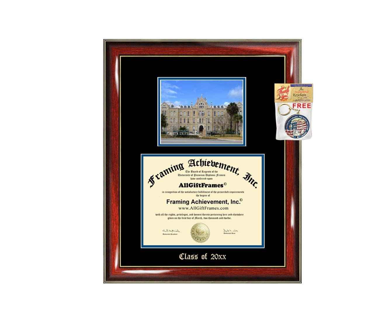 Custom Emboss quality large St. Mary's University Texas degree frames and certificate frames with school campus photo using state-of-the-art quality control techniques to display achievement. Selling a variety of matted personalized embossing elite wood custom college university St. Marys diploma frames with campus photo image. All certificate frames are custom made to fit your diploma document sizes. St. Mary's University Texas diploma frame campus school photo with school image picture college picture image as a graduation gift that showcase a beautiful unique degree or certificate degree plaque. These graduation St. Marys custom diploma frames can display professional certifications and degrees with a campus image. This diploma frame holder case features a beautiful Engraved Document Plaque Glossy Prestige Mahogany with Gold Accents Wood Moulding Graduate Plaque Frame Gift and school photo. This eye-catching stunning St. Mary's University Texas diploma frame makes it a unique graduation gift idea for law school, college, university, engineering, medical school, dental school, nursing graduates etc.. Includes Double-matting Top mat (Black), backboard, pH balance matboards help preserve and protect your diploma, glass and hanging hardware. All certificate college frames are custom made to fit your diploma sizes. Vast selection of college degree St. Marys frames to fit a bachelor, masters, mba, doctorate, juris doctor, phd, nursing etc.. degrees at cheap prices.