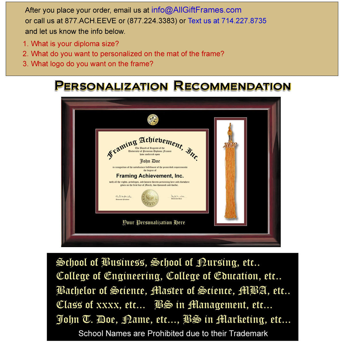 After you place your order, contact us through Etsy email or Text us at 714.227.8735 or put info in "Note to Seller" field box and let us know your "diploma size," "personalization" and "logo info"