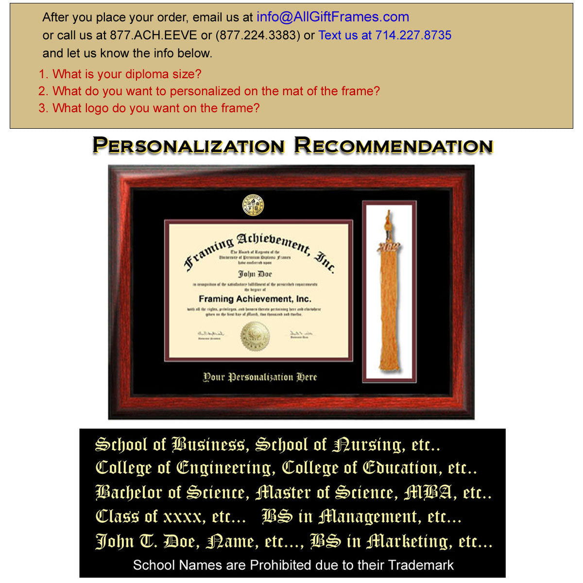 After you place your order, contact us through Etsy email or Text us at 714.227.8735 or put info in "Note to Seller" field box and let us know your "diploma size," "personalization" and "logo info"