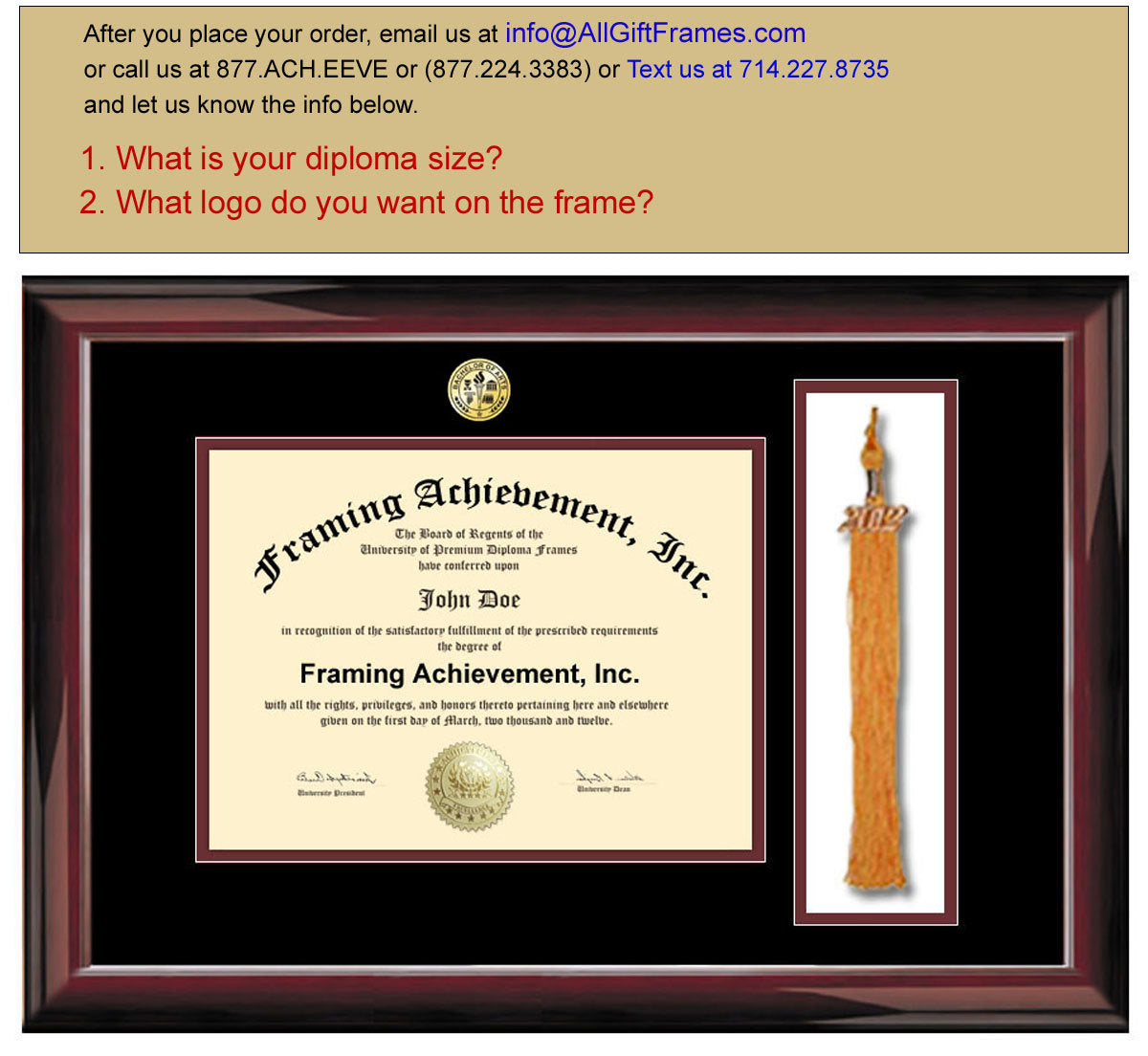 After you place your order, contact us through Etsy email or Text us at 714.227.8735 or put info in "Note to Seller" field box and let us know your "diploma size," and "logo info"
