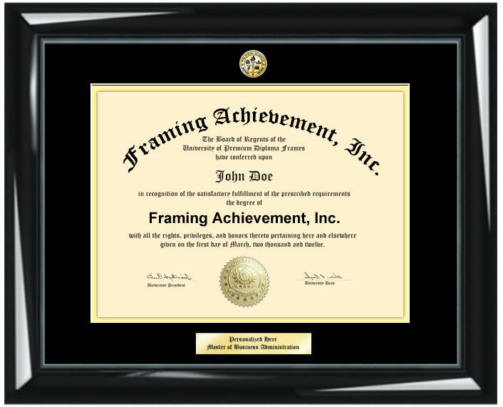 University Diploma Frames Graduation Gifts Graduates Glossy Majestic Black College Diploma Frame Top mat Black Inner mat Gold Degree Framing. Personalized degree frames, college diploma frames and certificate plaques with college major medallion logos and are wholesale to college bookstores.