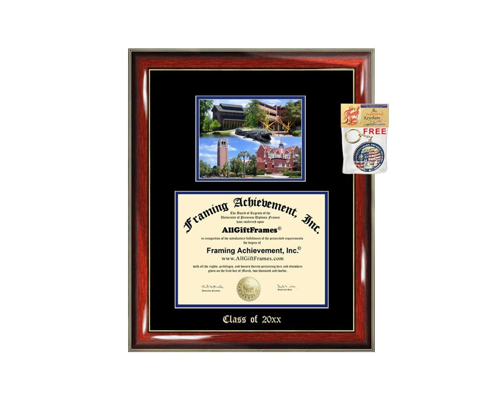 Custom Emboss quality large University of Florida degree frames and certificate frames with school campus photo using state-of-the-art quality control techniques to display achievement. Selling a variety of matted personalized embossing elite wood custom college university diploma frames with campus photo image. All certificate frames are custom made to fit your University of Florida diploma document sizes. University UF diploma frame campus school photo with school image picture college picture image as a graduation gift that showcase a unique degree display case or certificate degree plaque.