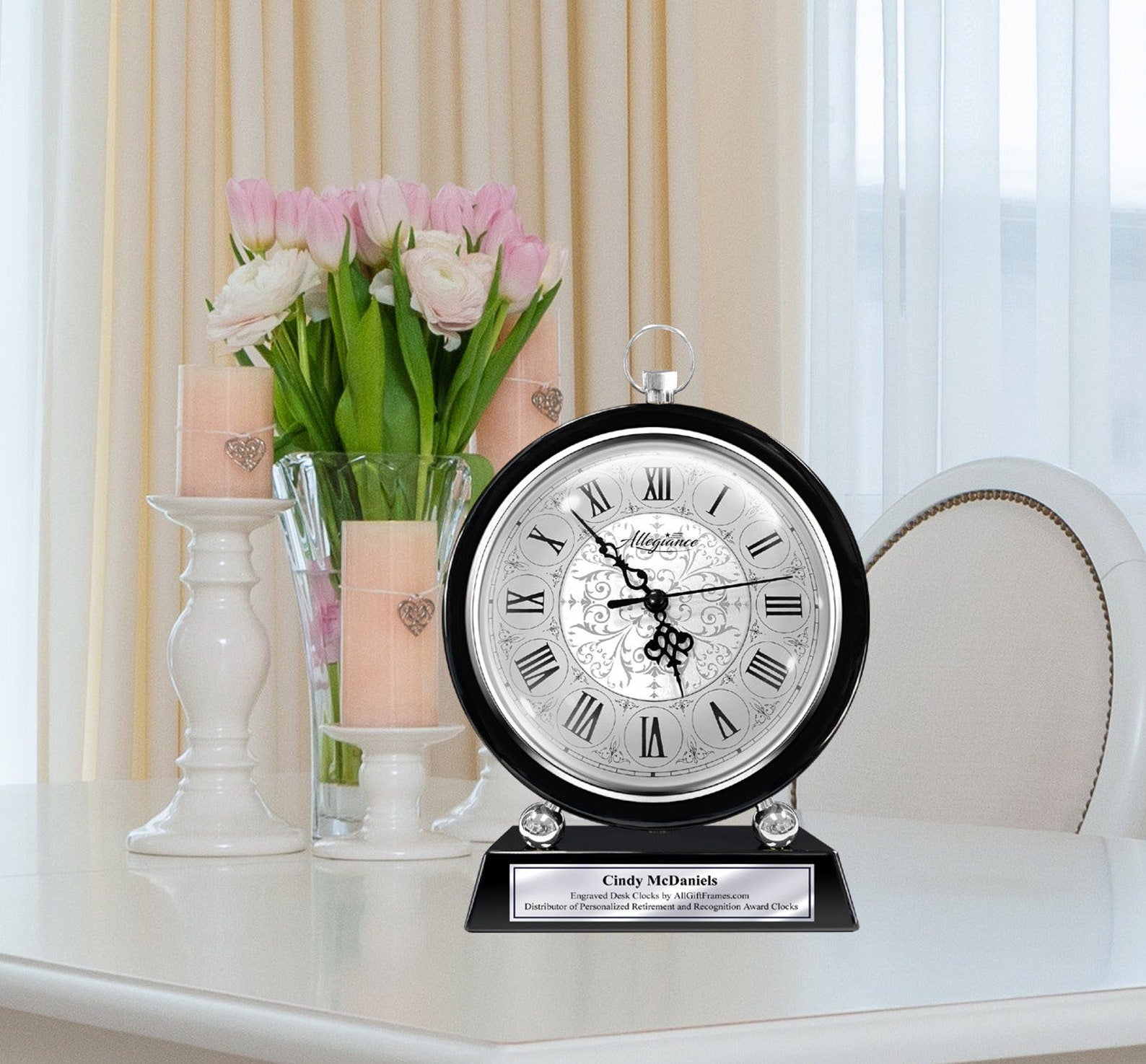 Large Silver Personalized Desk Clock Engravable Majestic Black Base Home Office Decor Accent Anniversary Employee Service Award Retirement Clock
