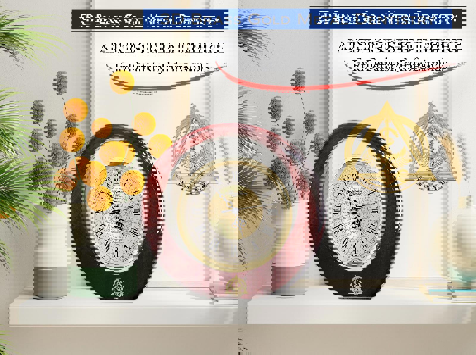 A unique gift idea for DMD, DDS professionals. Natural polished wood stand encompass a gold design element clock with elegant roman numerals, second hand and deluxe quartz movement. The DMD metallic Venetian design dial element insert clock cradles above the base of the circular glistening polished wood design. An eye-catching birthday, anniversary wedding, promotion, housewarming and retirement gift for any home or office decor. A 3D brass metal gold dentistry logo tops this sleek styled mantel award clock that epitomizes the look of success. We appropriately capture dental hygienist DDS professionals such as Doctor of Medicine in Dentistry employee years of service recognition, boss promotion and coworker retirement with our memorable brass gold dentistry logo shelf table desk eclipse wood clock. Quality materials of cherry wood casing with gold metallic Venetian embellishment design element clock dial blend to make an artistic sculpture as a company employee dental DMD appreciation award and remarkable dentist birthday gift. The sophisticated designer styling of this tabletop accent timepiece creates an award of distinction and a gift of recognition and appreciation toward the dental profession employee, dental hygienist coworker, boss or colleague.