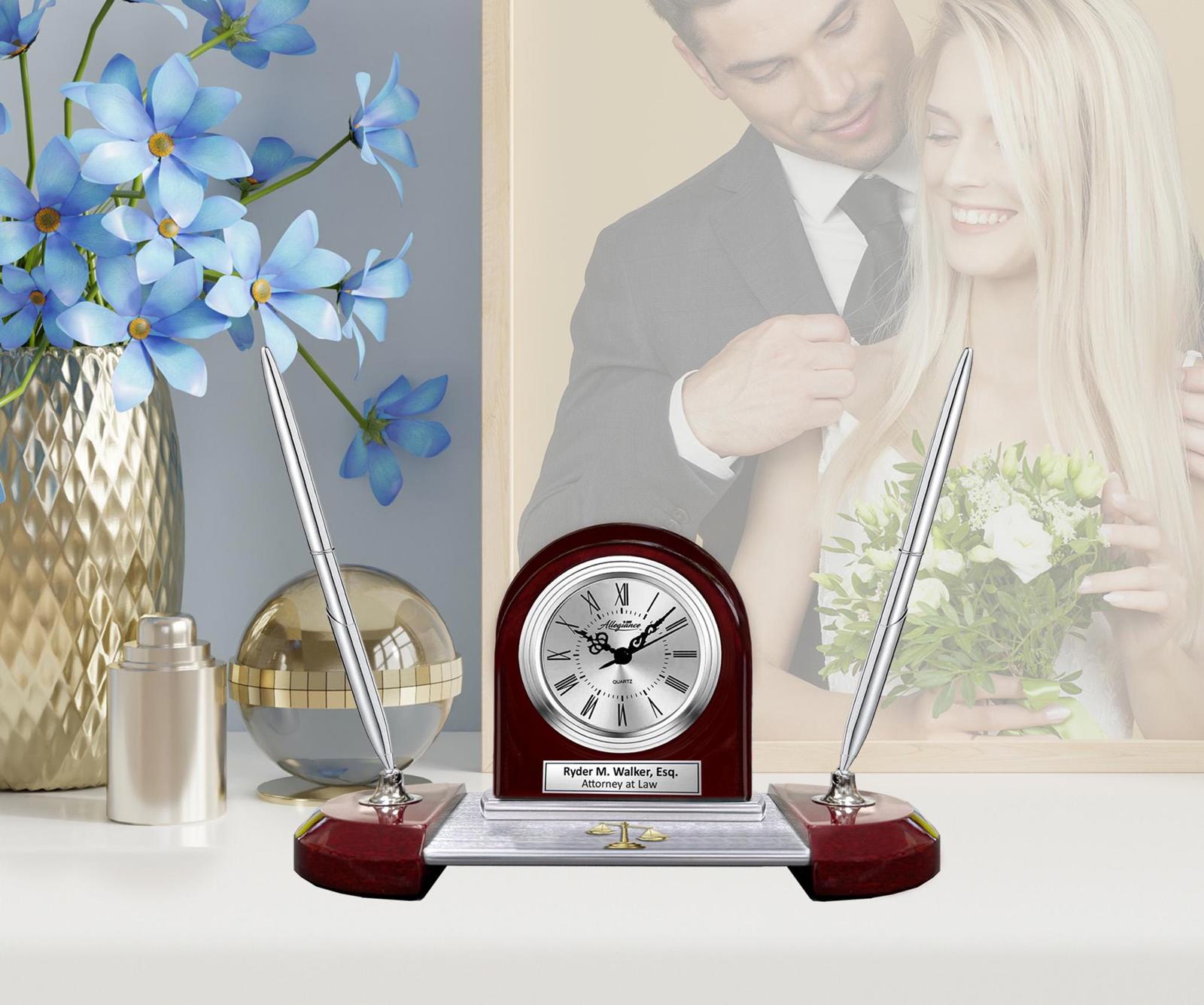 Custom engraved table clock with silver engraving plaque and a personal message or retirement wishes to the lawyer or passing the bar recipient symbolizes the importance of appreciation and recognition.