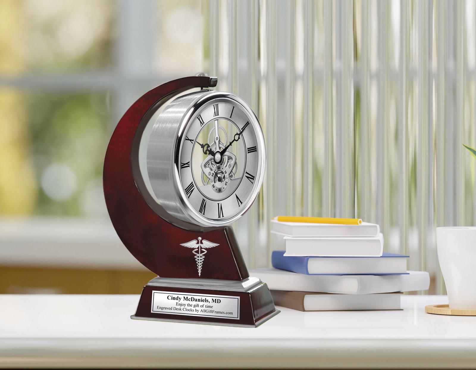 360 degree manual rotating silver mechanism gear clock with roman numerals, a second hand, and deluxe quartz movement graces the registered nurse, medical doctor or physician associate. Personalized laser engraved plaque desk clock design innovation timepiece and 3d chrome medical caduceus come together to create congratulation residency and fellowship engraved desk clock with distinction. This dynamic moving metal gear clock is encased in brush silver aluminum and mounted on a wooden base with brush silver accents. The stunning focal point of this magnificent timepiece is the glistening chrome gear movements in the clock dial that is suspended on a polished sleek curvature wood design. The Legacy clock can manually swivel 360 degrees in an intriguing manner and has a modern look for a timeless appeal. Experience the true joy of employee recognition or doctor nurse birthday gift requires taking a moment to reflect and appreciate your coworker or friend. Add a touch of elegance by recognizing the nurse or doctor by adding a personalized engraving plaque. A special unique doctor nurse thank you gift idea for him and her.