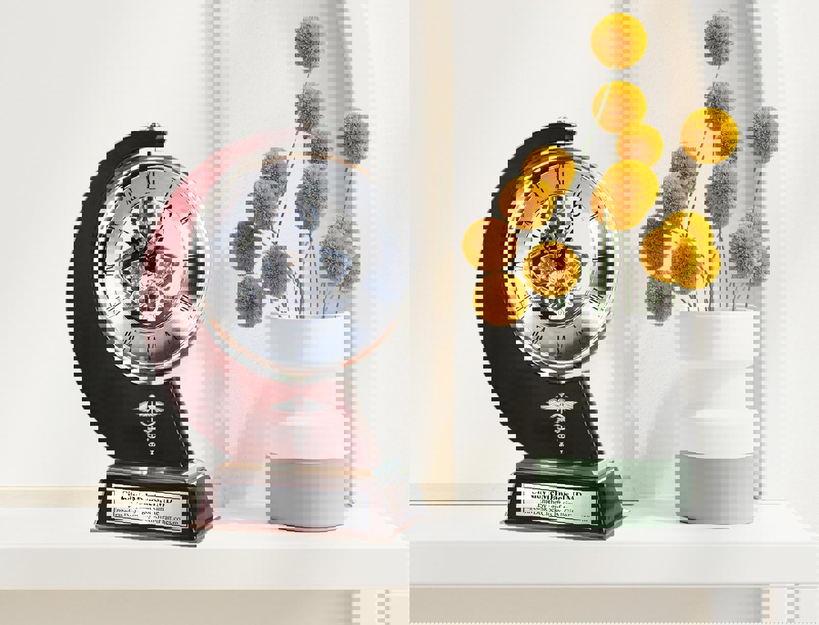 Our medical caduceus personalized gift clock collection are characterized by incredible beauty, innovation and quality craftsmanship. The polished cherry wood curved design desk clock features a personalized silver engraved plaque, brush aluminum moving gear mechanism clock casing, high gloss wood veneer and silver aluminum base accent all handcrafted.