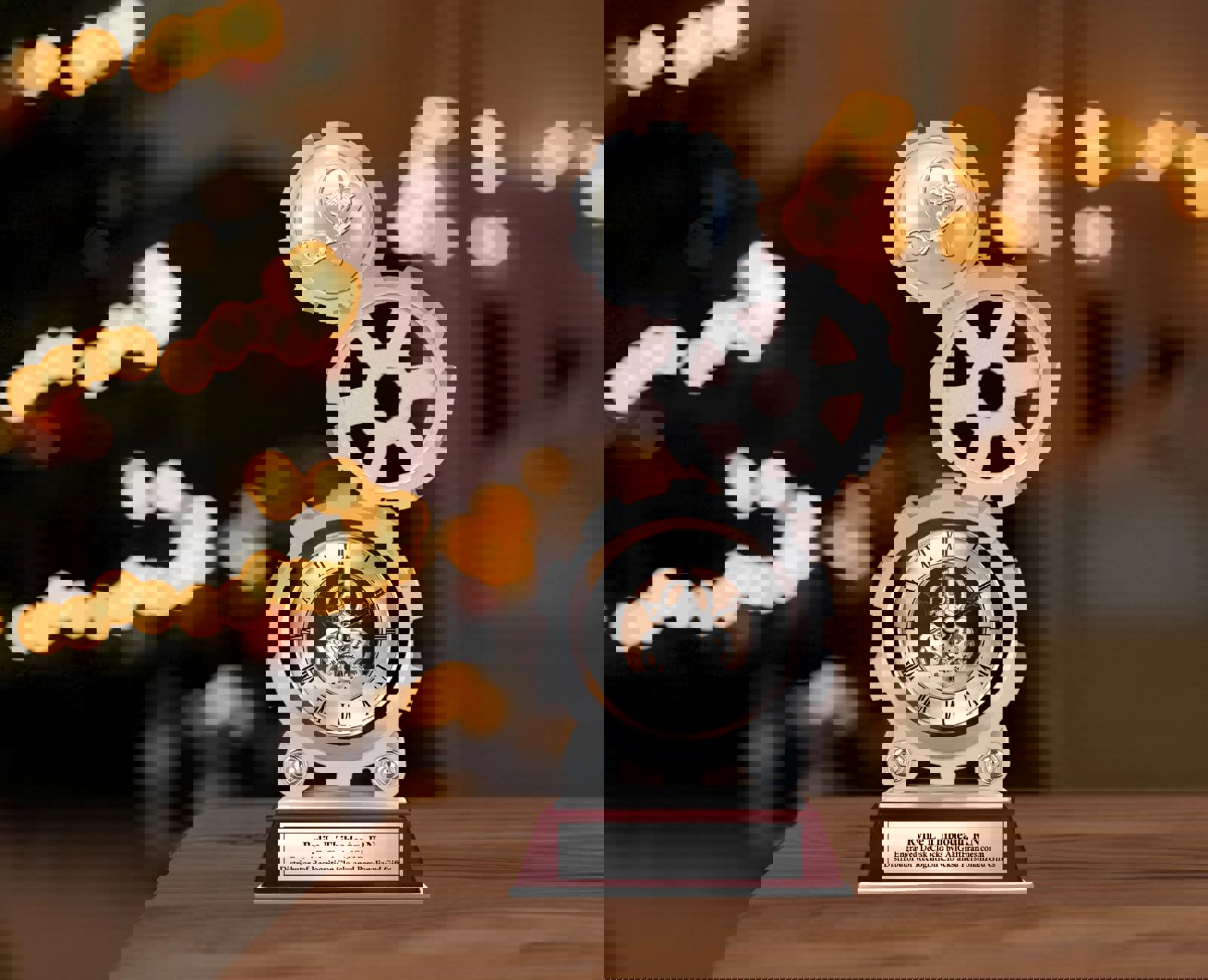 The three gear shape design desk clock design with a touch of personalization on a silver engraving plaque mounted on a wooden cherry base is brilliant and graceful. Towering different size engineering gear shape layers provides a spacious platform for creative personalized congratulation message etchings perfectly suited to congratulate coworker nurse, boss doctor or colleague physician assistant years of service, appreciation or retirement.