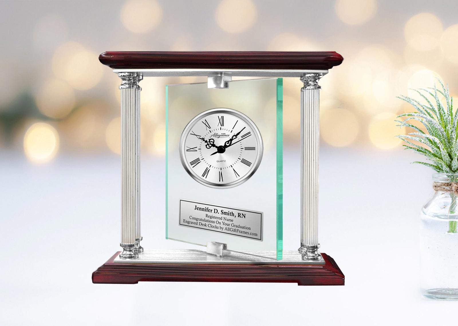 By etching a title of the recipient such as Doctor of Medicine, Doctor of Osteopathic Medicine, Physician Associate Assistant, Registered Nurse, Nurse Practitioner, etc.. you are able to create a prestigious graduation gift, medical residency fellowship award, healthcare hospital service award or nurse retirement gift. The manual spinning sculpted congratulation thank you nurse retirement engraved clock forms a appealing achievement billboard by combining four metal columns, beveled crystal glass with solid cherry wood top and base. A silver engraved plaque clock is expertly mounted in the beveled glass panel with a 3D brass gold Stethoscope Medical Caduceus logo and placed at an imaginative angle on this uniquely admired retirement recognition congratulation promotion award.