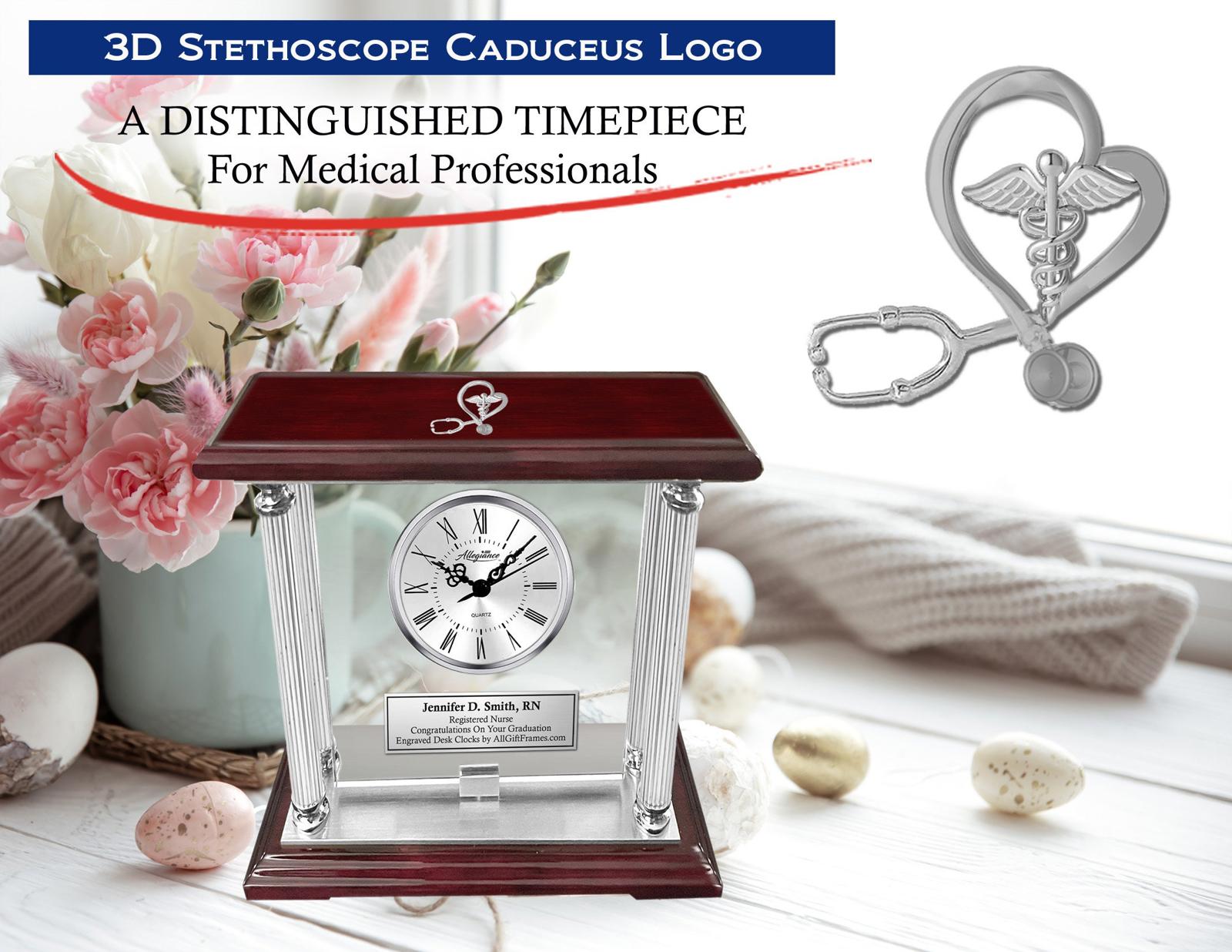 Breathtaking beautiful congratulation clock awards are created with a personalized engraved thank you appreciation DO MD RN Registered Nurse BSN recognition plaque with glistening cherry wood top and base. The congrats present engraved desk clock nameplate pen business card display holder has been used as congratulation medical school graduation, nursing school graduation, registered nurse gift and service awards for promoted medical thank you exceptional recognition gifts. The crisp, cool brilliance of gold metal brass pillars radiates from this stunning award engraved clock with Stethoscope Medical Caduceus insignia that is a unique employee service award, retirement gift or medical nursing school graduation gift. A gift of time for RN Nurse Practitioner BSN MSN DNP professionals.