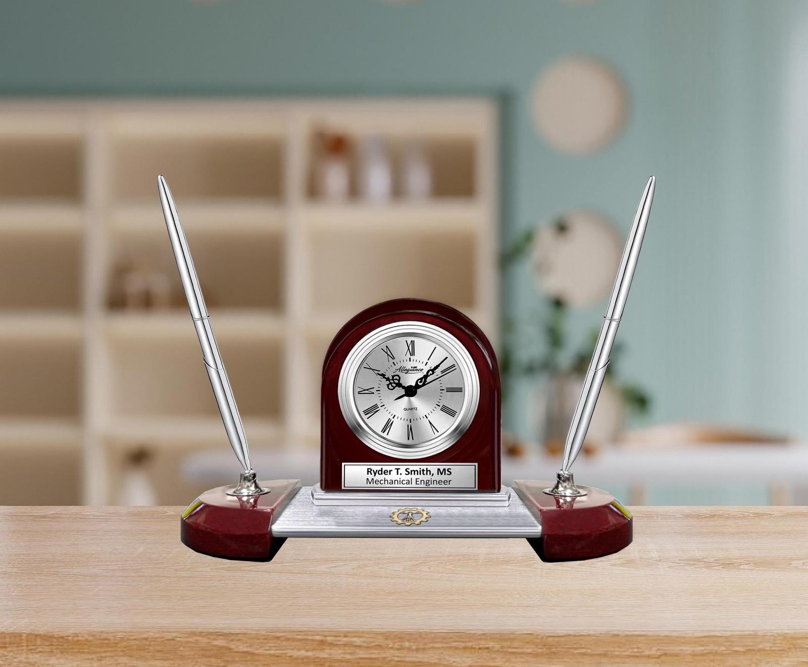♥ Luxurious name plate tabletop engraved desk clock with two silver metal pens
