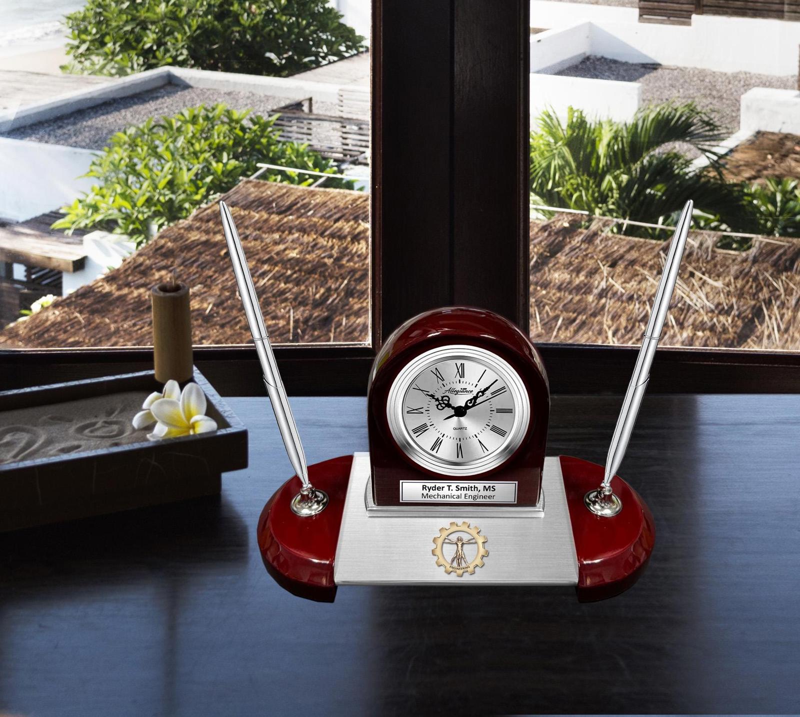 Smartly contrasting brush metal base ridges paired with polished cherry wood accents accentuate the stunning clock with ornamental hour and minute time needle and deluxe quartz movement. An silver finish aluminum adorning the metal base sets off the round angular cherry wood letting its brilliance shine with two metal pens. This silver desk name plate engraved plaque clock will brighten up any award recognition professional engineer recipient. Breathtaking promotion award dual pen nameplate plaque desk clock gift is of an unparalleled design. As unique, made of solid wood and beautiful silver aluminum, this personalize engraved desk clock magnificently hold two metal pens with a dual tone gold metal gold da Vinci engineering gear vitruvian man logo for the colleague, boss, coworker and friend.