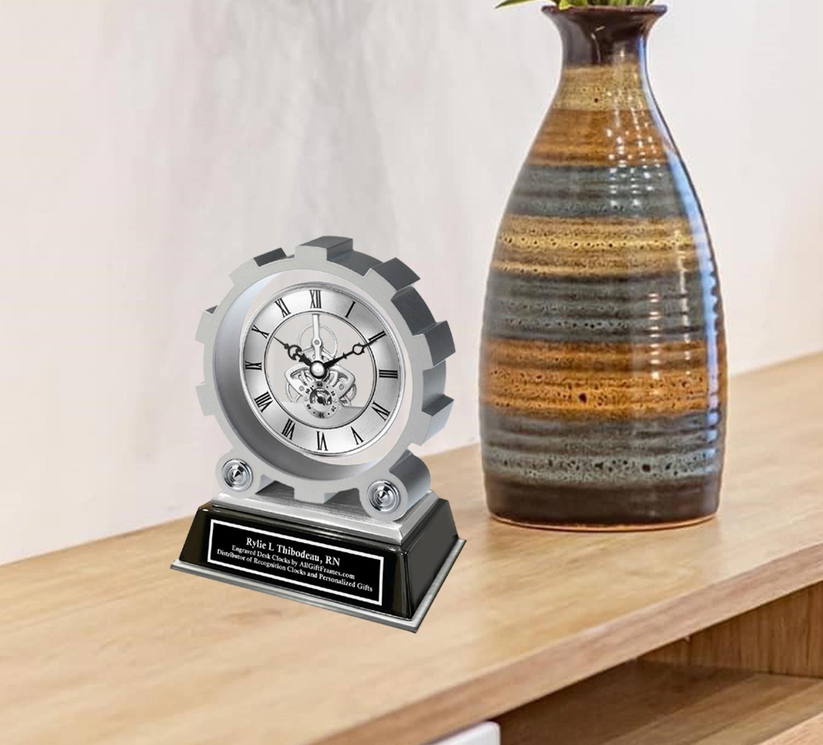 Silver Da Vinci Desk Clock Metal Transparent Gear Clock with Wood Glossy Black Base and Silver Engraving Plate. Personalized Engraved Desk Clock Silver Engraving Plate as a unique Anniversary Wedding Gift, Corporate Business Employee Service Retirement Appreciation Award and Birthday Graduation Gift.