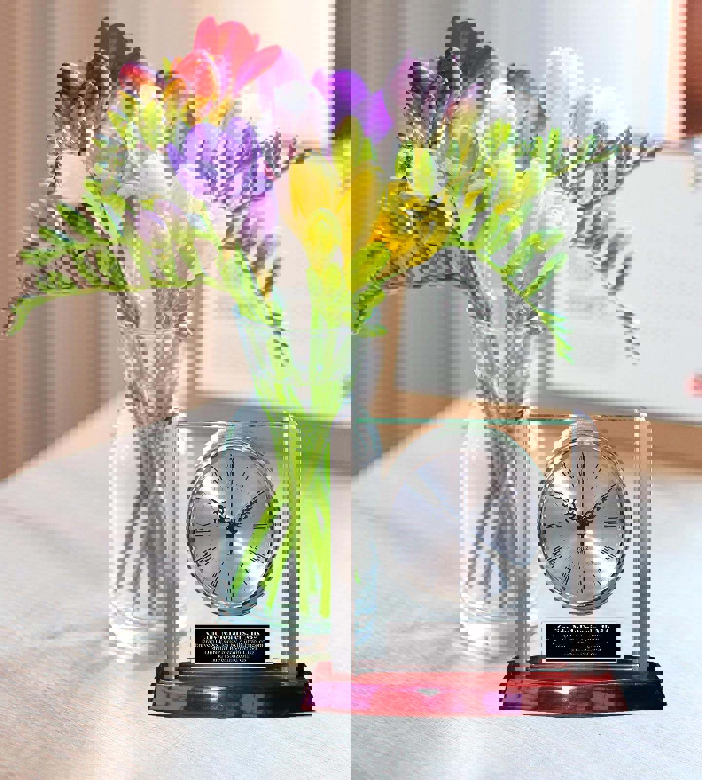 Aluminum silver pillars embrace the rectangular beveled glass insert with a radiance roman numeral clock. Polished sleek glistening wooden base emerges to a complete clock gift to any recipient. A silver personalization plate is expertly engraved and placed on the glass of this uniquely admired clock.