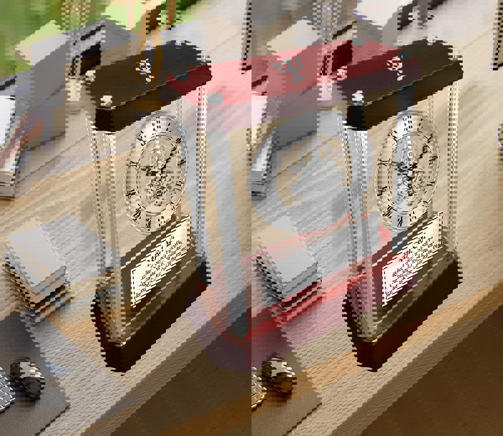 The glossy cherry wood finish top and base creates a unique appreciation personalized gift for the psychologist. A touch of silver highlights the rich cherry finished wood trim desk engraved clock. The opulent hues of deep personalized engraved plaque give way to the radiance of your etched inscription. This trophy award timepiece embody the very essence of a quality years of service award recognition clock for the university of college psychology school graduate, student or retiree. The passion to be number one is displayed in all success stories for any Psychiatrist employee coworker or boss. It is the desire to achieve that sets apart so give them a unique timepiece as a employee years of service award. They followed their dreams and built solid foundations from which to soar to the top. This table top glass encase silver column Da Vinci mechanical gear clock as promotion gift salutes those efforts.