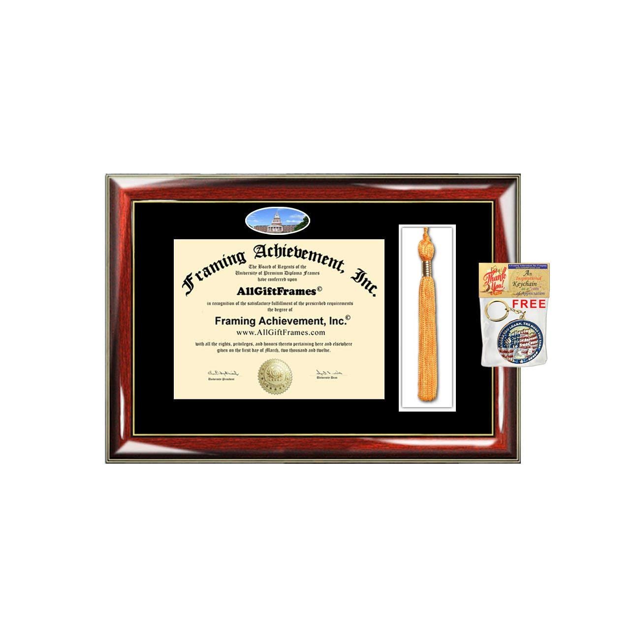 With our tassel diploma case holder High Point University diploma frame with campus photo, the sentimental value are endless. Our variety of graduation degree plaques truly encourages you to create the perfect gift for treasured and priceless degrees and certificates. The certificate frame and college university frame includes a small campus photo image approximately 1.5H x 3W. If you have any questions email us through AchievementGifts (Amazon) or AllGiftFrames. Includes Complimentary Inspirational Quotes Gold Keychain Gift by AllGiftFrames These graduation HPU diploma frames can display professional certifications and degrees with a campus image. We acknowledge and congratulate high school, college or trade school graduates by providing High Point University diploma framing tassel box service to the alumni. Share the joy of giving and expressing congratulations to the graduate by framing a diploma in an elegant HPU tassel holder degree frame. These premier HPU diploma tassel holder boxed frames with campus image picture are unique graduation gifts. Manufacture of high quality premium personalized custom diploma frames and certificate plaques. Whether you're looking for elegant graduation diploma frame gift idea, personalized high school or college graduate gift, law school graduate gift or simply personalize graduation frames, we can help with the customizing gift. Let us be your custom High Point University diploma framing gift shop for a Bachelor, Masters, MBA, Doctorate, PhD, Juris Doctor or medical degree. All certificate college frames are custom made to fit your diploma sizes. Vast selection of college degree frames to fit a bachelor, masters, mba, doctorate, juris doctor, phd, nursing etc.. degrees at cheap prices.