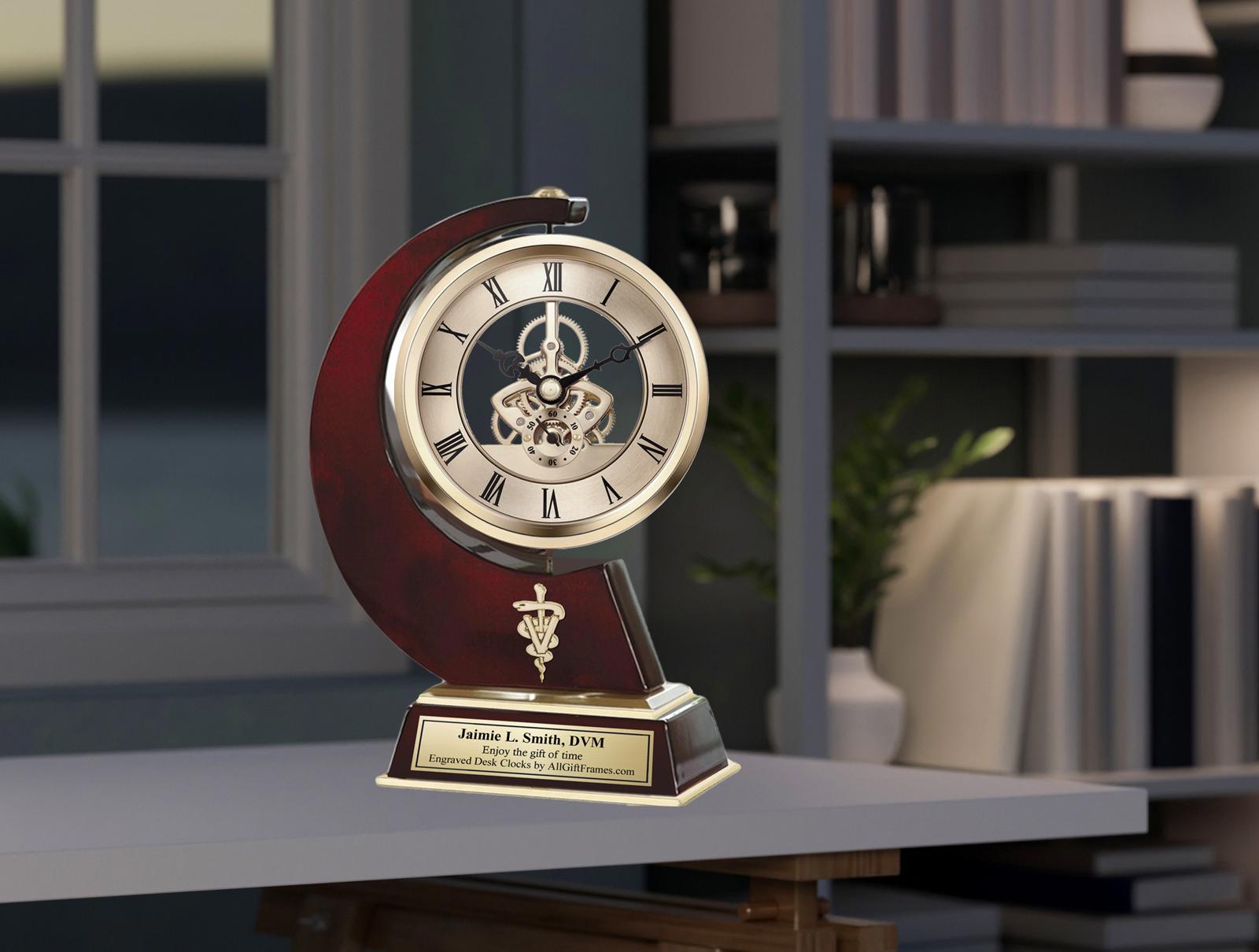 Embrace the exquisite custom craftsmanship & timeless appeal of this dramatic sought after desktop table etched brass gold swivel wooden mechanical moving gear quartz clock. An opulent unique engraved clock for DVM professionals that raises the bar in quality, functional and unique retirement, service award, thank you and veterinarian school graduation gift. Sultry table clock design forms, brilliant metallic gold metals and unique veterinarian, DVM and Doctor of Veterinary Medicine. The veterinarian college school congratulation personalized table top mantel clock built to recognized the veterinarian professional. The gold engraved desk metal mantel clock features a 360 degree manual spinning aluminum clock casing that suspend a mechanical moving mechanism gear clock on cherry wooden base. The objective of giving a recognition, service award, retirement, appreciation, veterinarian school graduation gift is to enhance and recognized achievement to the DVM colleague employee or thank you veterinarian gift. A special unique thank you gift idea for him and her.