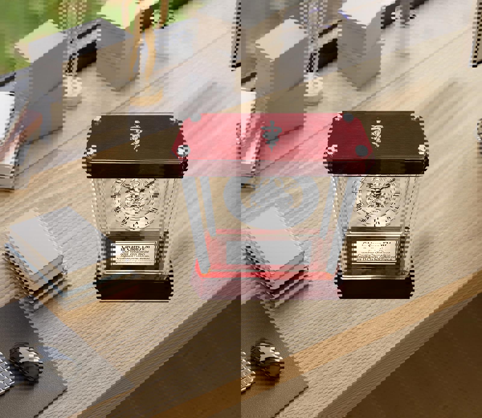 The glossy cherry wood finish top and base creates a unique appreciation personalized gift for the veterinarian. A touch of silver highlights the rich cherry finished wood trim desk engraved clock. The opulent hues of deep personalized engraved plaque give way to the radiance of your etched inscription. This DVM trophy award graduation gift timepiece embody the very essence of a quality years of service award recognition clock for the university of college veterinary school graduate, student or retiree. The passion to be number one is displayed in all success stories for any doctor of veterinary medicine employee coworker or boss. It is the desire to achieve that sets apart so give them a unique timepiece as a employee years of service award. They followed their dreams and built solid foundations from which to soar to the top. This table top glass encase silver column Da Vinci mechanical gear clock as promotion gift salutes those efforts.