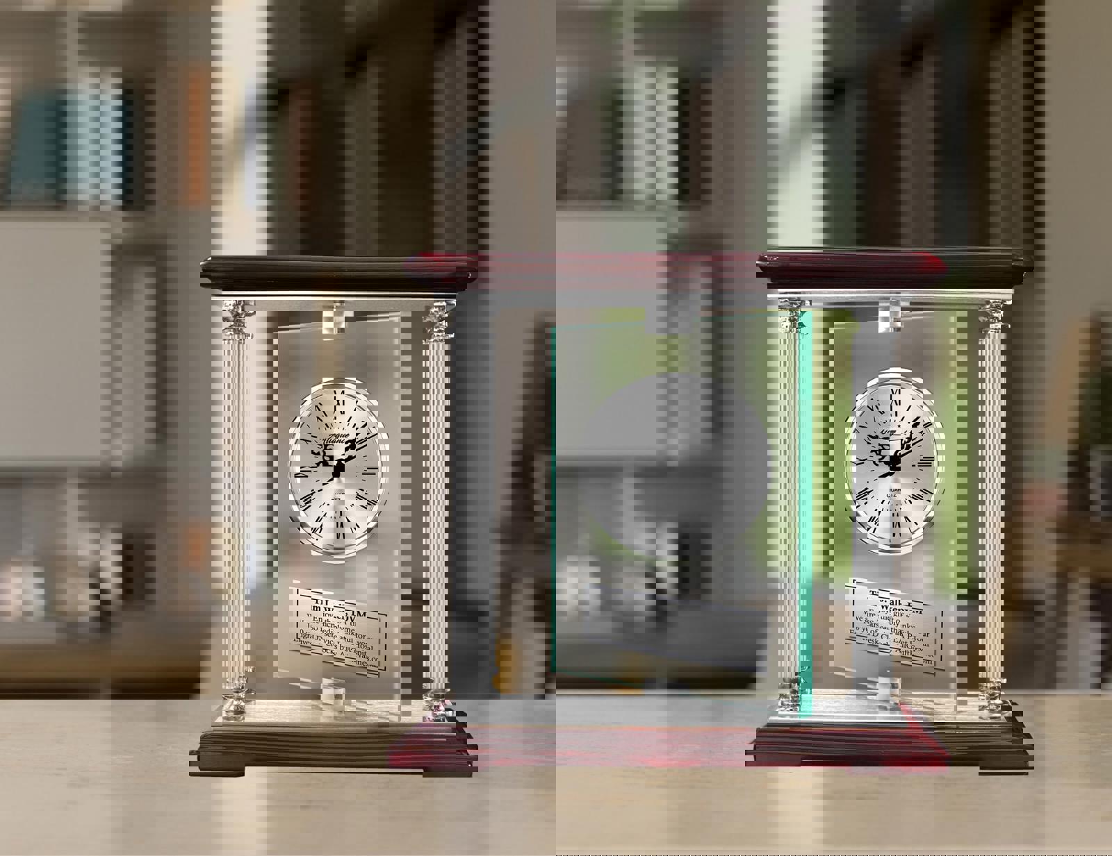 Embrace the exquisite custom craftsmanship & timeless appeal of this dramatic sought-after desktop table etched glass silver clock. The engraved desk silver glass aluminum metal mantel clock features a 360 degree manual rotating glass panel mounted with a silver clock on cherry wooden base that is surrounded by 4 silver metal aluminum pillars. With its top and bottom polished wooden base, along with a silver engraving plaque, will let your words of veterinarian congratulations shine bright in a manner to inspire all. The manual rotating personalized congratulation mantel clock embody both warmth & contemporary aesthetics for veterinary office or veterinarian home decor.