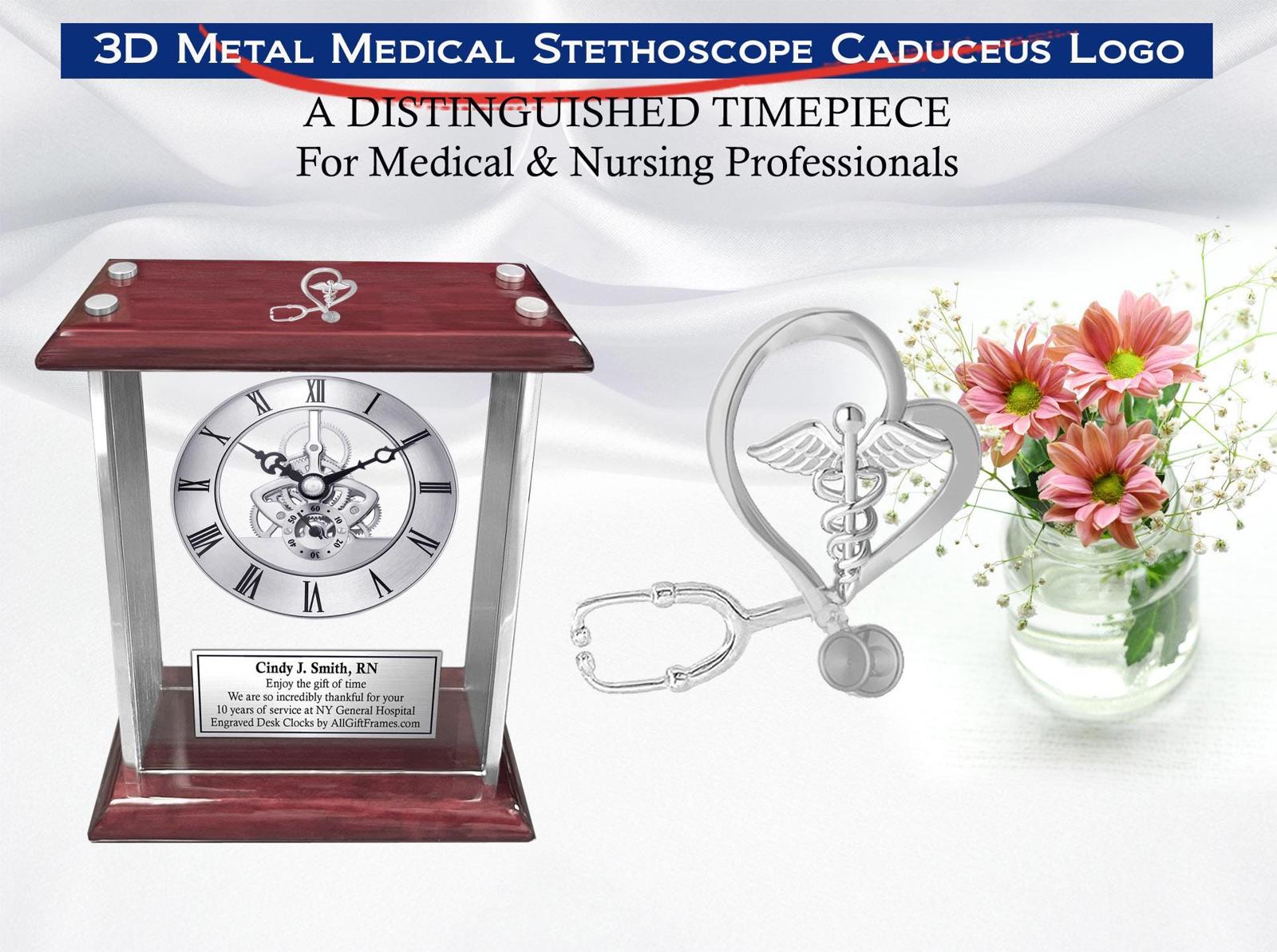 The glass panel forms a clock casing by combining aluminum side column support, etched plaque and moving gear mechanism time display. A touch of premium service award retirement healthcare nursing medical school graduation engraved clock that has a 3D stethoscope medical caduceus emblem mounted on top of the rich cherry wood timepiece highlights the unique Doctor of Osteopathic Medicine RN Registered Nurse BSN Bachelor of Science in Nursing Physician Assistant Associate Executive and Medical Hospital professions. Sleek rich cherry top and base, polished on all sides, emerges to complete a beautiful retirement appreciation thank you Doctor of Medicine MD DO medical school graduation gift. The opulent aluminum metal hues of the side panels give way to the radiance of an etched inscription on the service award desk clock. These engraved clock awards embody the very essence of a quality doctor nurse physician medical profession years of service retirement congratulation appreciation thank you award present.