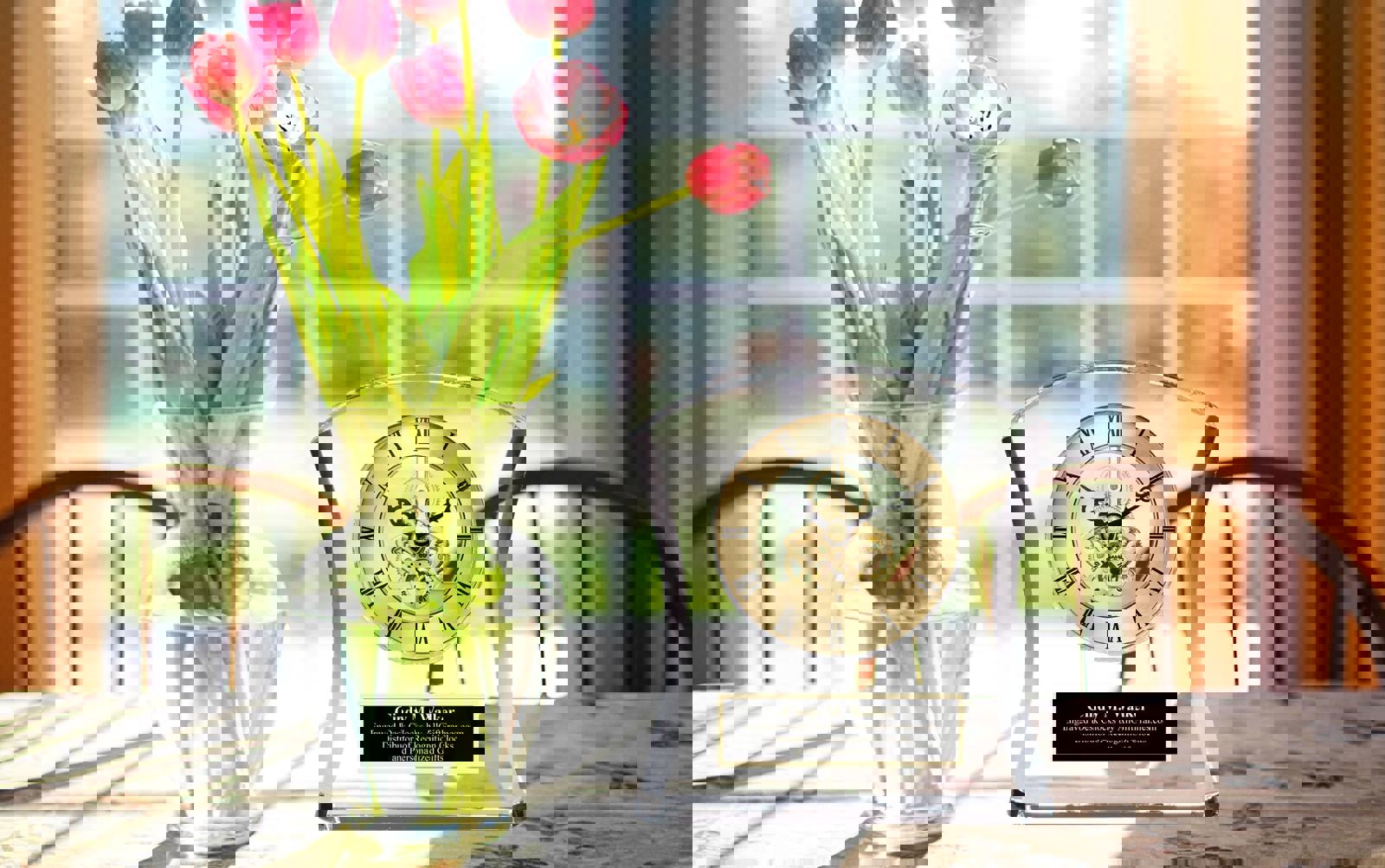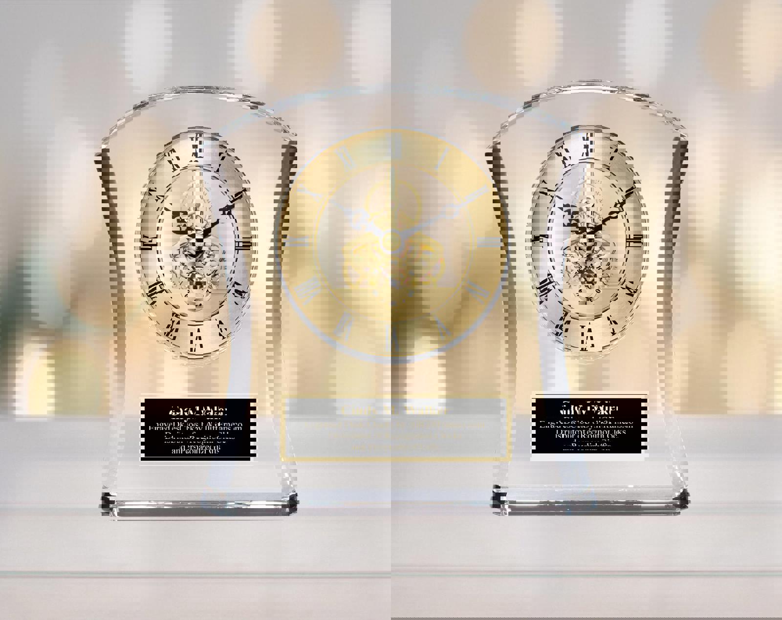 Personalized optical curve crystal with black engraving plate etched with gold etching. A beautiful unique moving gear clock enclosed inside the crystal casing. Distinctive sultry curved crystal case with DaVinci moving gear clock stand out and remind exceptional accomplishments deserve to be recognized with a magnificent executive employee retirement gift. This Purity Contour desk clock is a gift of elegance. Glistening clear crystal design case radiating from a sleek style define the timepiece. Brilliant in shine. Opulence in style, this clock features the finest quality crystals giving sparkling shine to a glistening display containing a gold DaVinci gear clock. The gold gear clock mechanisms move as the second, minute and hour hands rotates to tell time with elegant roman numerals complete its display. Compliment the beautiful accent clock with a personalized silver engraved plate. The Breathtaking Purity Contour tabletop clock embody the very essence of a quality retirement, promotion, anniversary or birthday gift. Or a gift for any occasion. Graduation, New Home and Housewarming mantle tabletop shelf desk clock will be applaud by the recipient.
