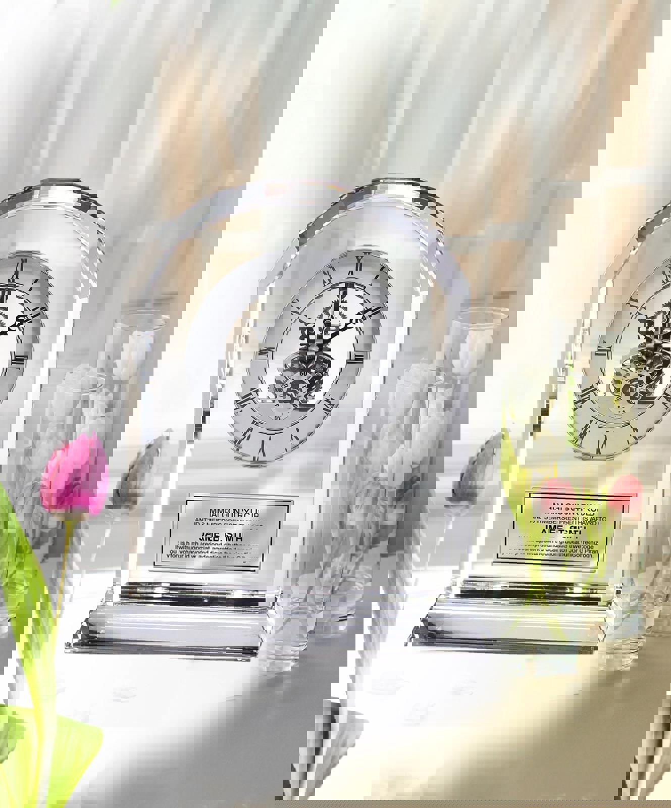 ♥ Diamond Cut Arch Crystal Engraved Clock with Silver Engraving Plate