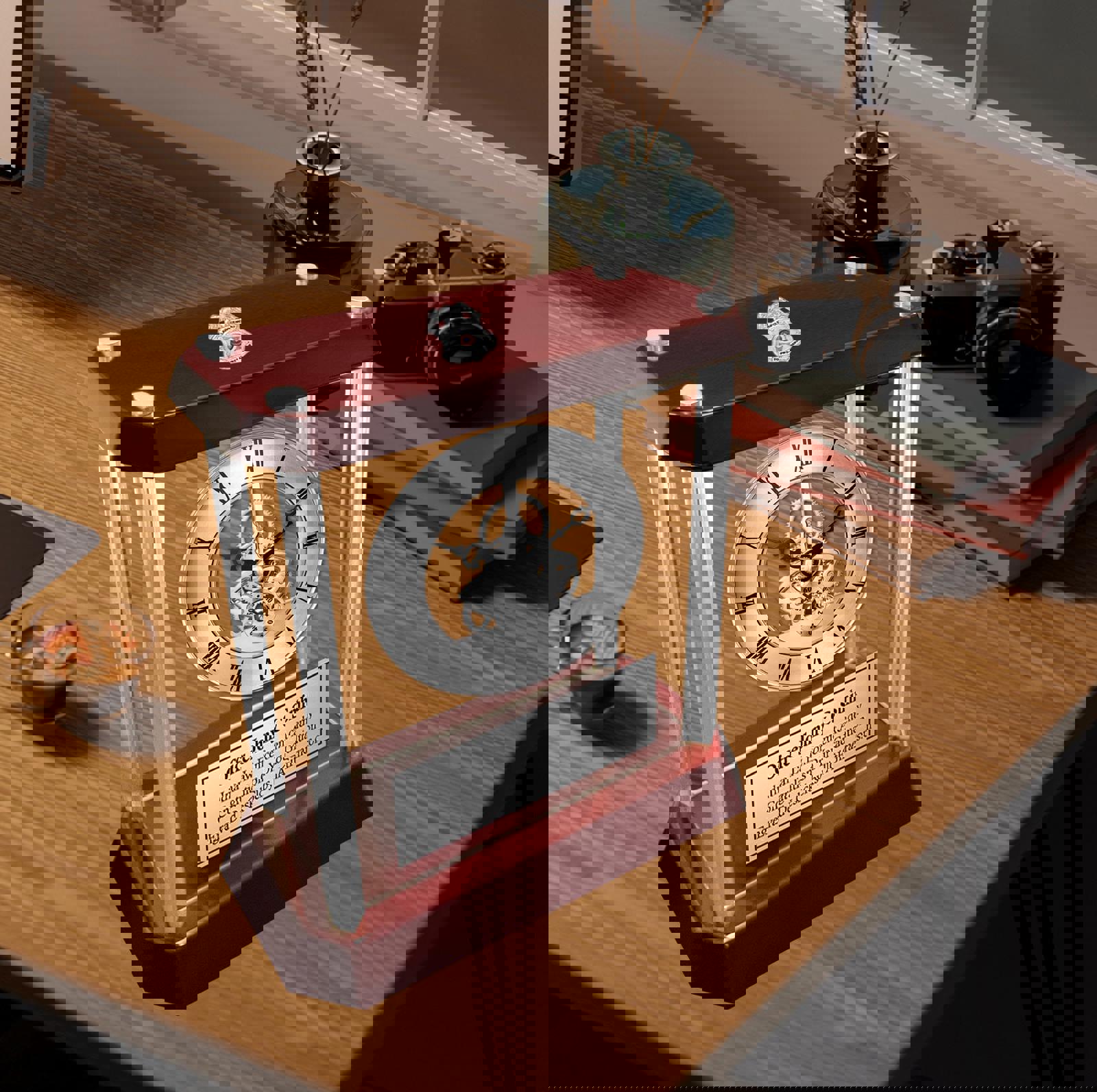 The glossy cherry wood finish top and base creates a unique appreciation personalized gift for the law enforcement DHS Homeland Security agent or officer policeman. A touch of silver highlights the rich cherry finished wood trim engraved clock that will make a unique thank you police officer end of watch retirement service award gift. The opulent hues of deep personalized engraved plaque give way to the radiance of your etched inscription. This law enforcement appreciation and detective recognition trophy award timepiece embody the very essence of a quality years of service award recognition clock for the law enforcement police academy school graduate. The passion to be number one is displayed in all success stories. It is the desire to achieve that sets law enforcement police officer apart. They followed their dreams and built solid foundations from which to soar to the top. This table top glass encase silver column DaVinci mechanical gear engraved personalize clock salutes those efforts.