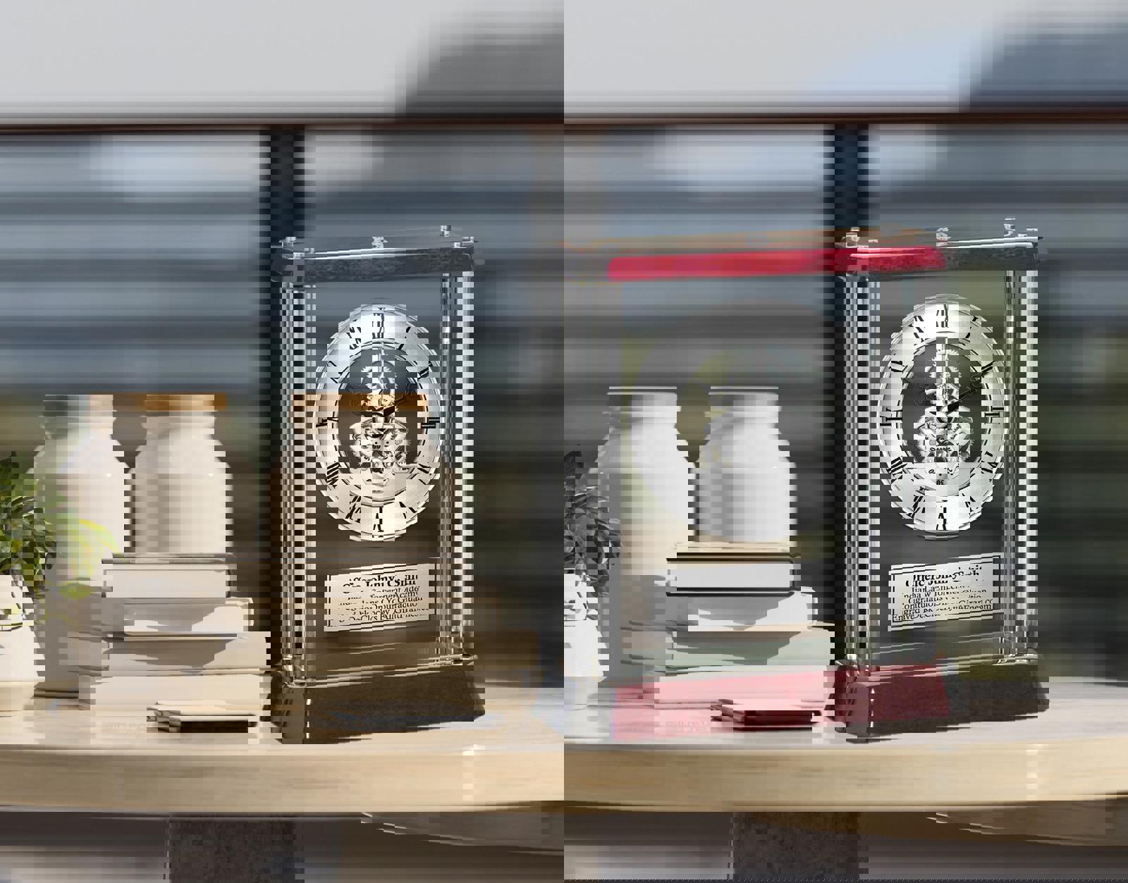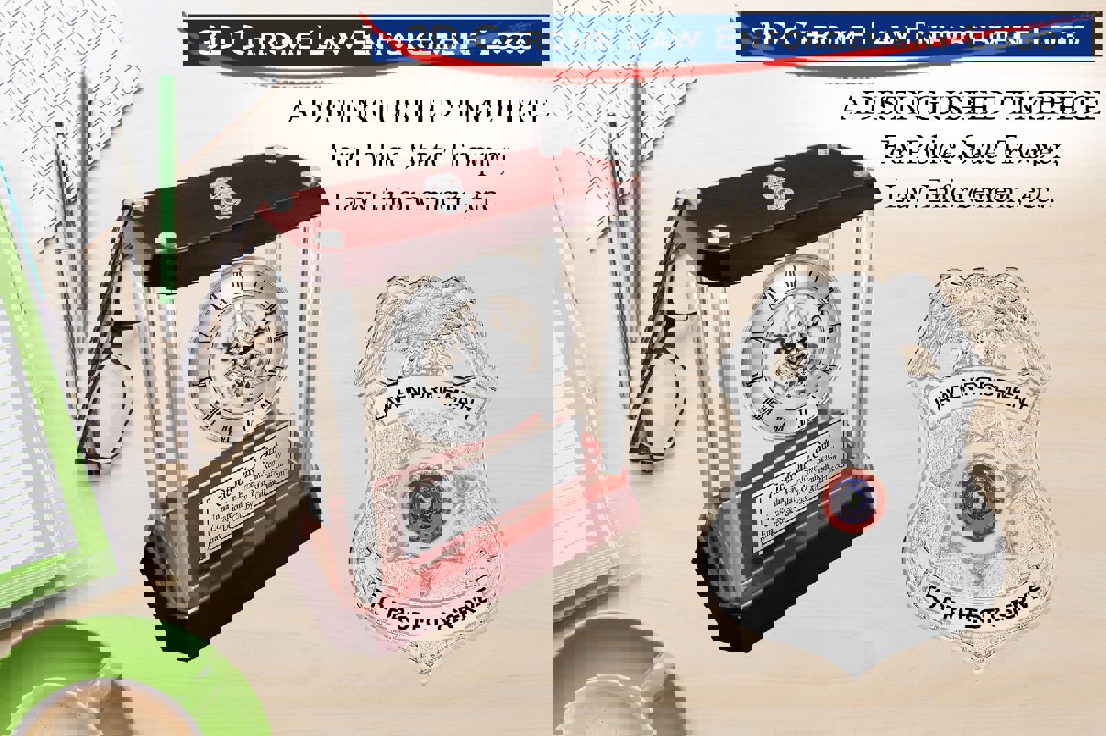 The recognition 3D Law Enforcement logo DaVinci silver gear desk clock accommodates four metal pillars, a protective encased glass clock and a silver engraved plaque with a spectacular elegant design.