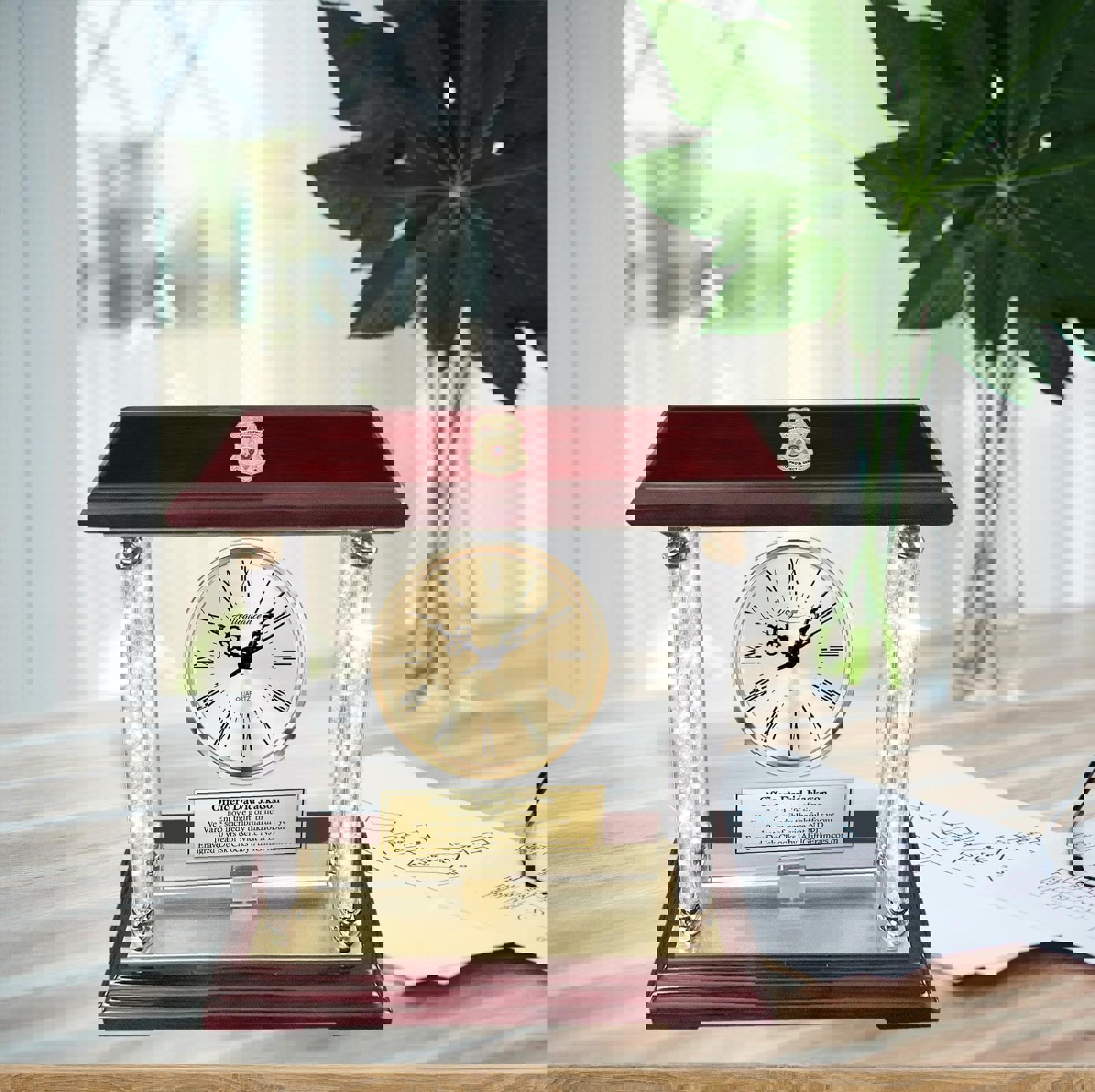 The gold desktop clock design carry a hinged rotating glass panel that swings 360 degrees to reveal your proudly etched congratulation message on the gold engraving plaque. 3D law enforcement badge logo along with four vibrant acrylic crystal diamond filled columns and a beautiful gold clock embedded in a 360 degrees manual swiveling glass brighten up any police officer retirement, detective recognition, police academy graduation, deputy sheriff appreciation service award and probation and correctional officer recipient. Cherry wood top and base are the perfect finishing touch for the four crystal diamond column desk table trophy engraved clock with 3D law enforcement badge logo. A unique law enforcement promotion gift for the police officer home or police department desk decor.