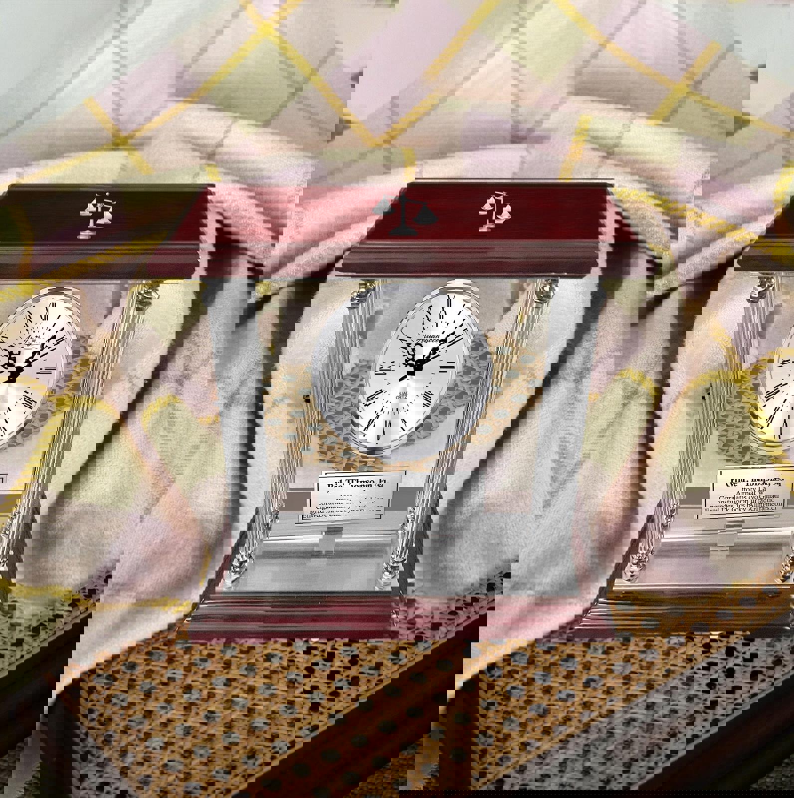 Embrace the exquisite custom craftsmanship & timeless appeal of this dramatic sought-after desktop table etched silver glass clock. With its top and bottom polished cherry wood top base, along with a silver engraving plaque, will let your words of congratulations shine bright in a manner to inspire all. The Juris Doctorate Esquire engraved tabletop mantel clock built to recognized the attorney, lawyer, judge, paralegal or legal professional. This 3d law scale emblem etched personalized award clock is a unique luxury timepiece with etched plaque display. Rarely does a law school graduation, passing state bar gift, retirement gift, law profession service award, paralegal recognition award clocks are stunning with timeless appeal. The manual rotating personalized mantel clock embody both warmth & contemporary aesthetics for law office or lawyer home decor. Celebrate new attorney, judge, paralegal or lawyer achievements with a congratulation gift desk clock which is a functional delightful gift for law school graduates or legal profession retirement service recognition awards. Shop our wide selection of congratulation law gift, attorney present, lawyer gift, passing bar gift.