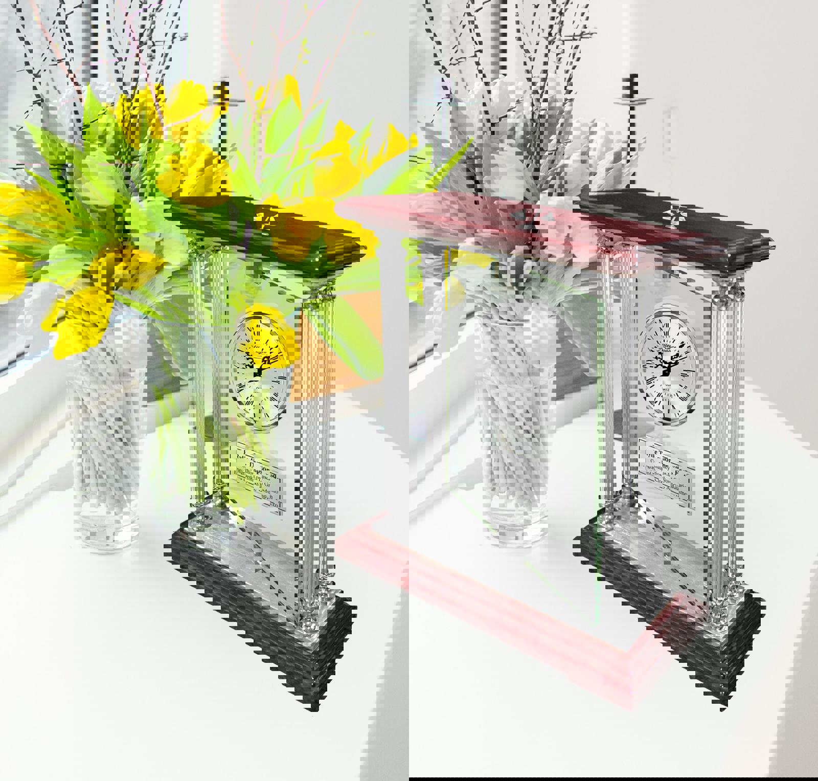 ♥ Premium Laser Engraved Quartz Movement Silver Clock Embedded in Manual Swiveling 360 Degree Glass. Four Metal Silver Aluminum Pillars with Silver Engraving Plaque on Shiny Cherry Wood Top and Base