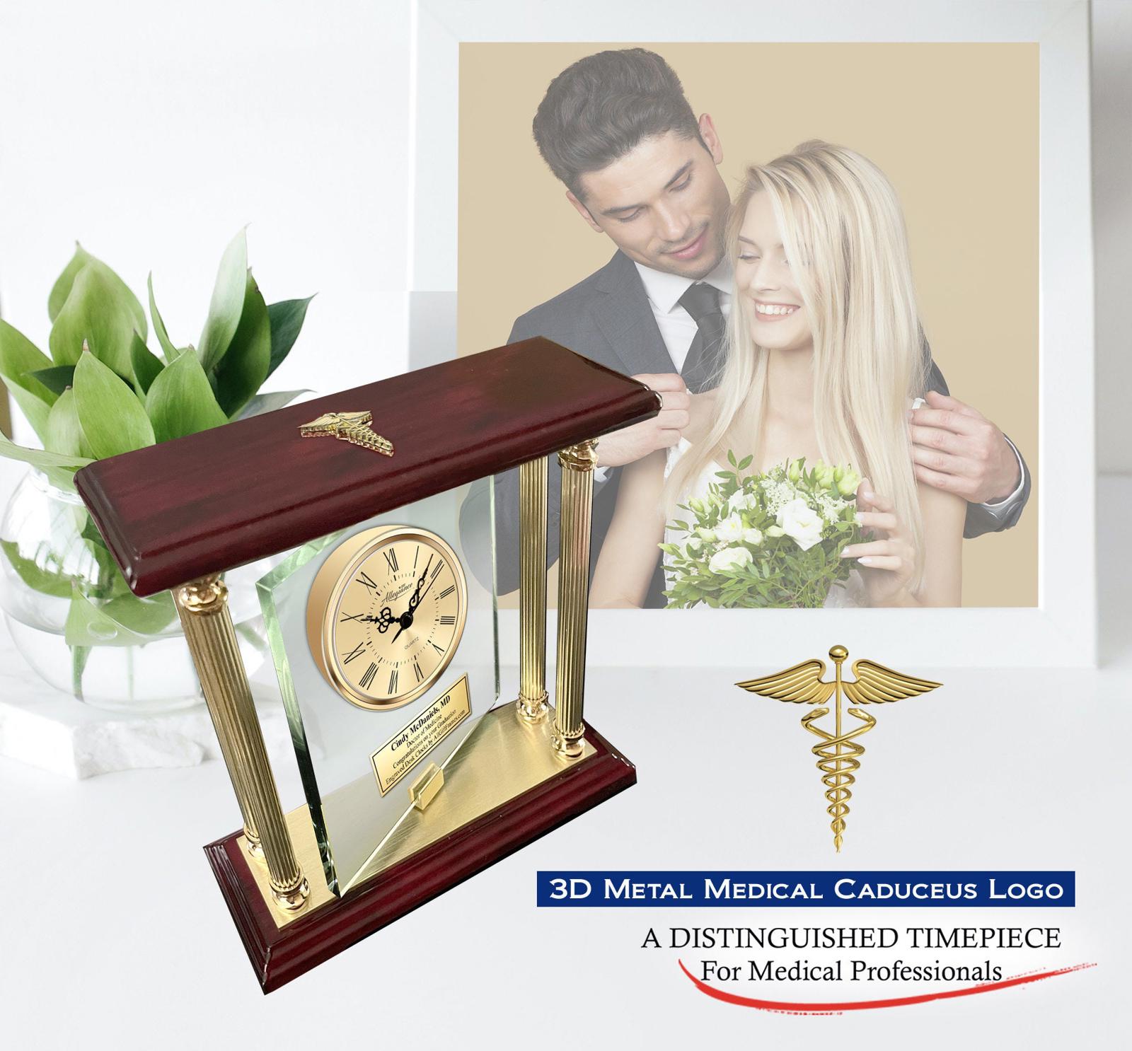 Unique luxurious 3D medical caduceus logo engraved desk clocks are available with personalization and will make a fabulous gift for doctor, physician, nurse, healthcare executive, hospital employee or registered nurse.