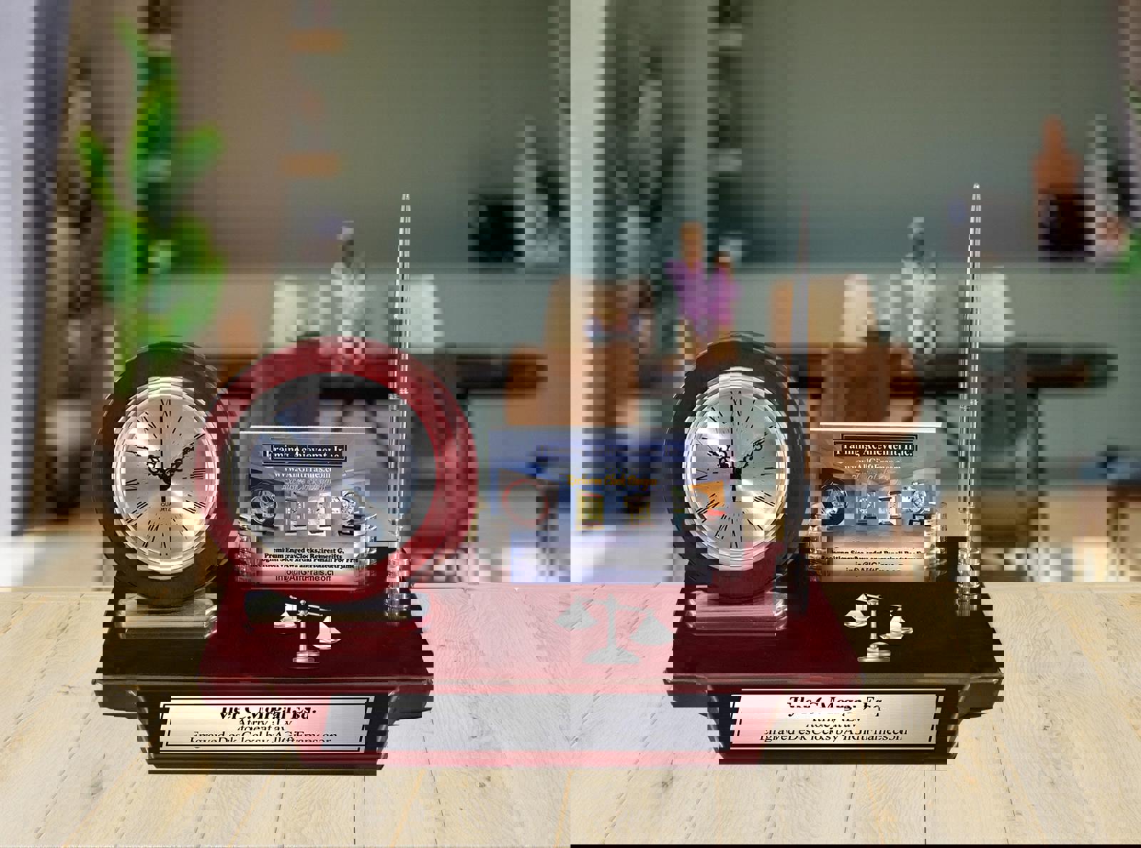 This award nameplate engraved desk clock with pen provide a generous area to allow your custom message or title etchings to take center stage. By personalized etching a title of the recipient such as Esquire, School of Law, University College of Law, etc.. you are able to create a prestigious college university law school graduation gift, lawyer award, attorney judge paralegal retirement gift. The engraved desk clock name plate pen business card display holder has been used as congratulation law school graduation, attorney thank you present and service awards for promoted judge paralegal thank you exceptional recognition award retirement congratulation appreciation passing bar present. The same attractive finish adorns the Juris Doctorate, attorney, lawyer, judge or paralegal service award, or law professional recipient.