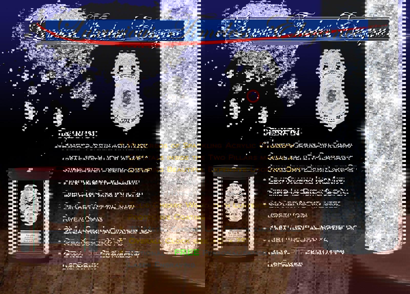 Journey through time and space, encapsulated in the most luxurious combination of materials and designs with this beautiful etched table top double crystal diamond column desk clock with 3D silver law enforcement logo. Crafted by skilled clock artisans, mottled hues of colorant cherry wood finishes and silver engraving plaque are applied to achieve a time-endured elegance, adding recognition sophistication to any probation or correctional police officer or police academy graduate. A stunning and alluring personalized dual acrylic crystal diamond filled pillar law enforcement logo award desk clock. This exquisitely crafted police officer retirement, police academy graduation gift, sheriff deputy birthday present or state trooper years of service award curates a unique design clock that convey modern-day elegance for police department employees. We endeavor to offer an engraved table clock for the law enforcement profession which embodies beauty and perfection, with an undeniable modern edge of distinction for the new police academy graduation graduate gift. Embrace the exquisite custom craftsmanship & timeless appeal of this dramatic law enforcement retirement or end of watch congratulation service award clock gift with 3D silver chrome law enforcement logo and personalized silver plaque.