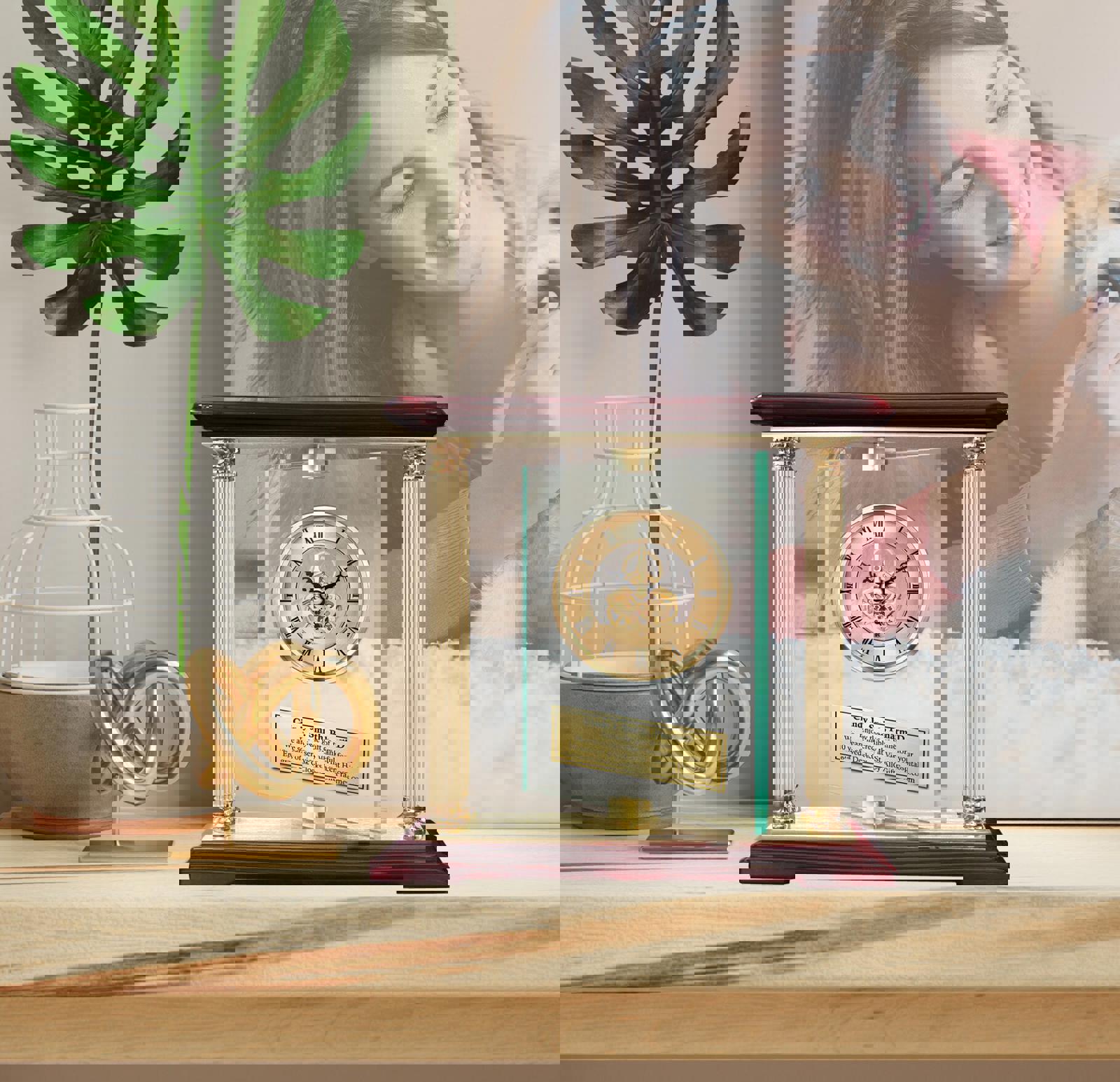 ♥ Premium laser engraved quartz movement clock embedded in manual swiveling 360 degree glass panel