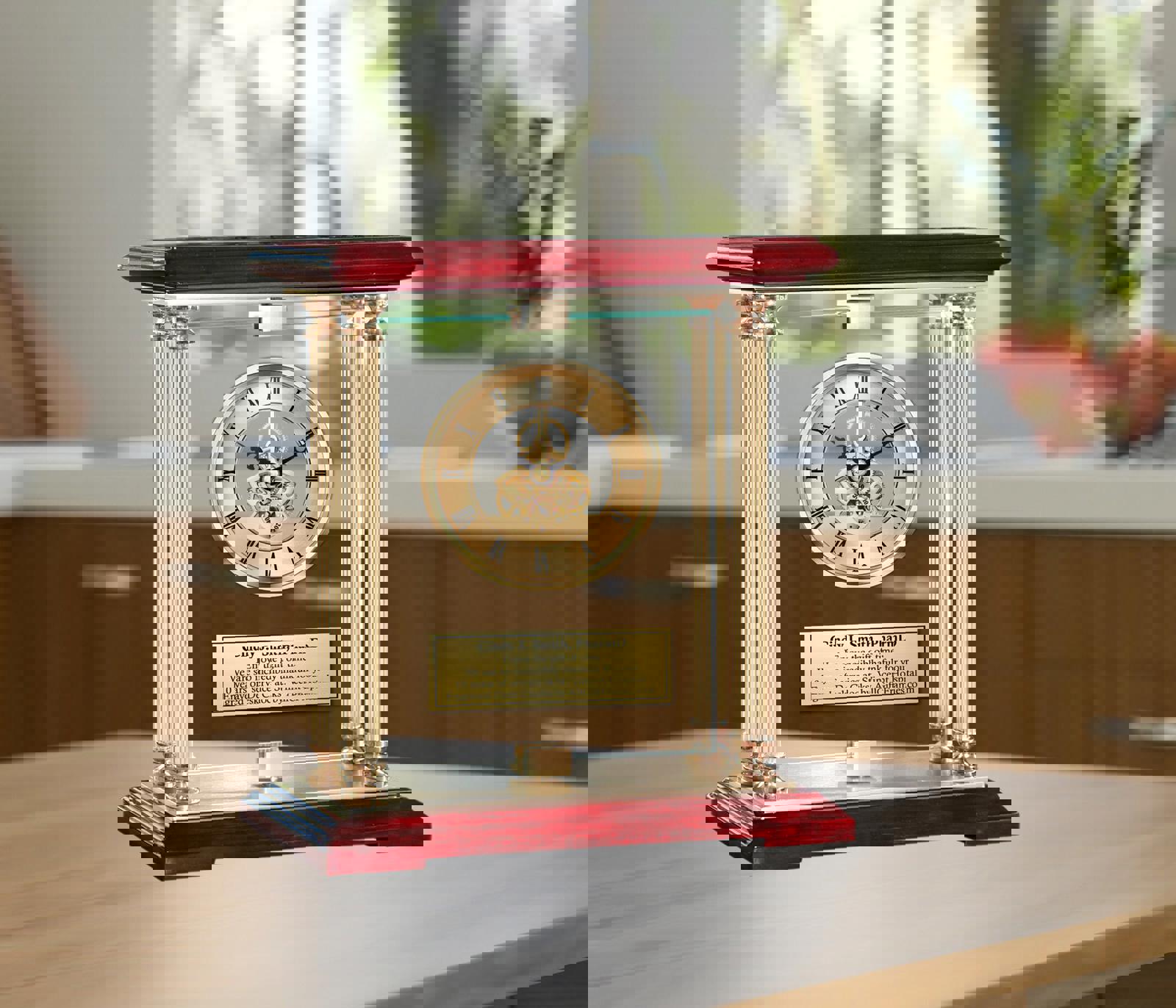Crisp, cool brilliance of gold metal brass pillars radiates from this stunning pharmacist or PharmD award engraved clock with brass gold mortar pestle RX logo that is a unique employee service award, retirement gift or pharmacy school graduation gift. This skillfully sculpted rounded top cherry wood design personalized gear clock brings to new heights. Whether displayed in an pharmacy office or home, the encore adds elegance to any decor. Breathtaking beautiful congratulation pharmacy employee coworker clock awards are created with a personalized engraved thank you appreciation recognition plaque mounted on glistening crystal clear glass panel.