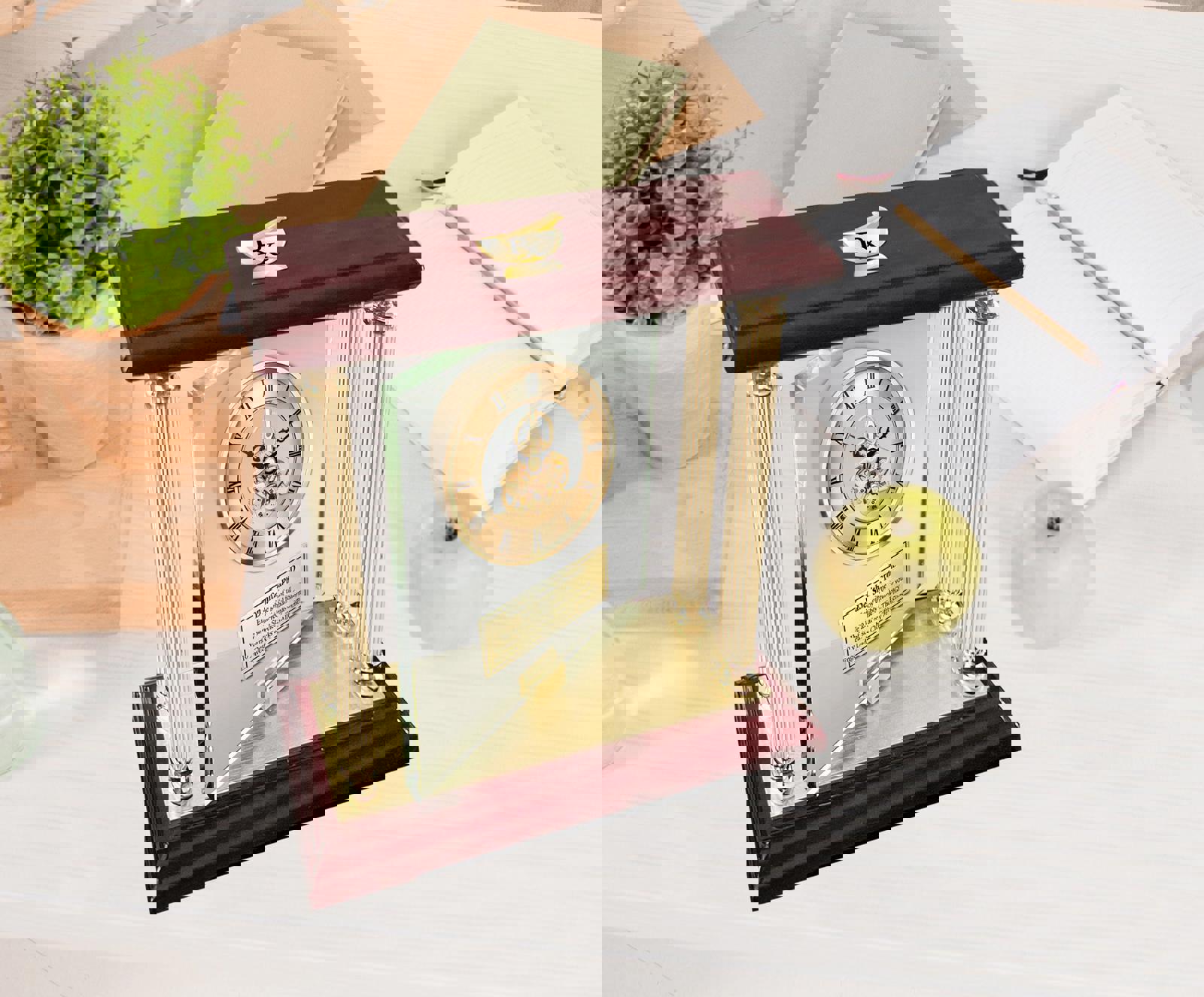 This personalized engraved desk clock embodied the very essence of a quality pharmacist gift. The gold engraved plaque is skillfully crafted into piercing images setting a lofty theme. A gift of time for pharmacist, pharmacy technician or doctor of pharmacy coworker employee boss recipient. Proudly engrave a special message of congratulations and gratitude in a truly unique, handsome manner to the pharmacist and pharmacy school graduate student. A gold mechanical gear dial engraved clock is expertly mounted in the beveled glass panel with a 3D brass gold mortar pestle Rx pharmacy logo and placed at an imaginative angle on this uniquely admired doctor of pharmacy retirement, pharmacist recognition, pharmacy school student congratulation, and pharmacy technician promotion trophy award.