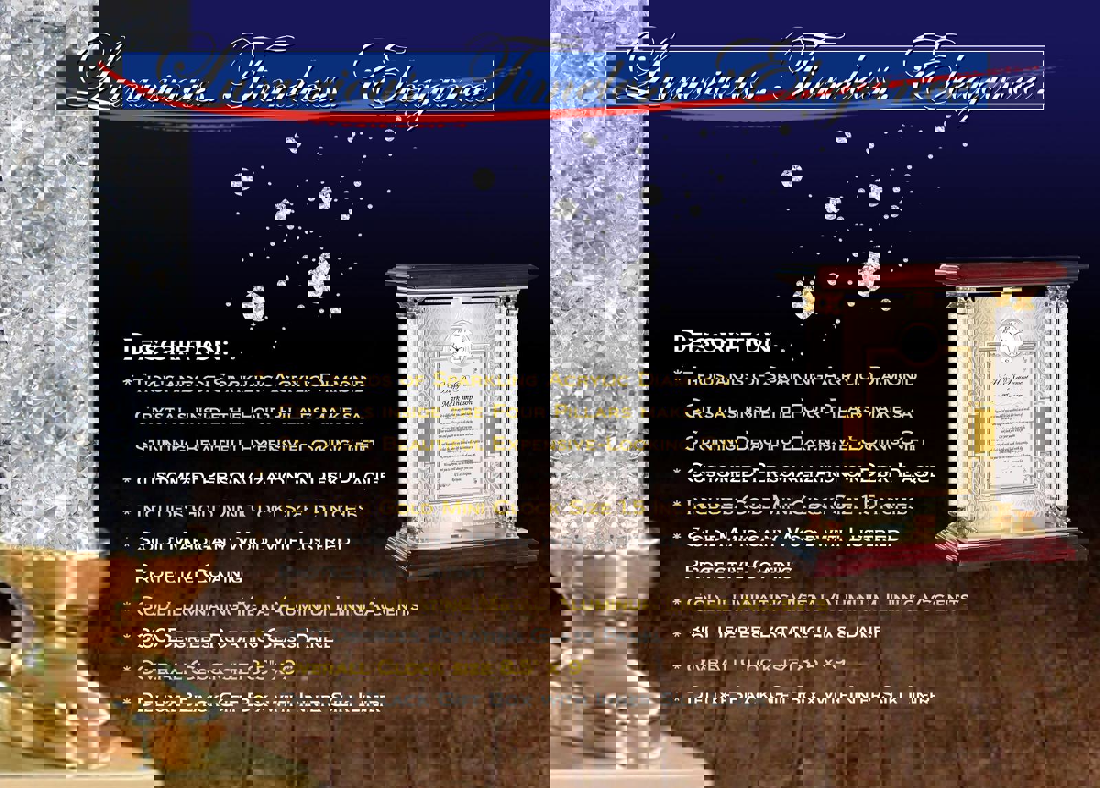 This luxurious gold brass personalized retirement clock is mounted on a wooden base with four column accents filled with spectacular thousands of acrylic crystal diamonds inside the post display settings.