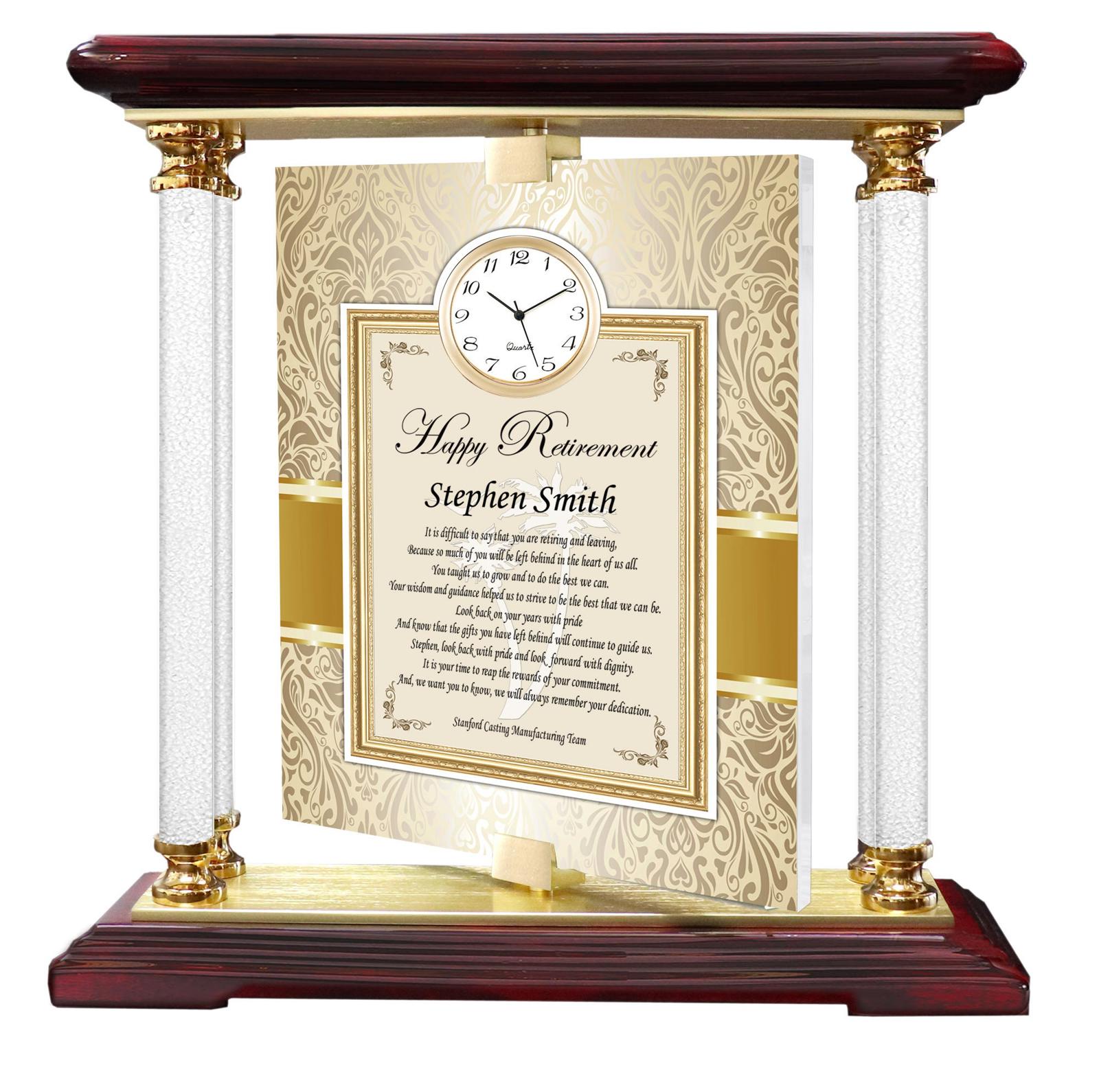 The stunning focal point of this magnificent timepiece is the glistening 360 degree pivoting retirement poem or message panel that is surrounded by four diamond columns. This corporate retirement award makes an intriguing and unique retirement gift with a modern look for timeless appeal. Experience the true joy of employee recognition appreciation thank you requires taking a moment to reflect and appreciate your coworker boss mom dad or friend. Add a touch of elegance by recognizing your colleague retiree by having a special retirement best wishes message on the clock plaque. The overall display clock size is 9" x 8.5" and weighs about 3 lbs. This is a visually appealing timepiece retirement gift. A timekeeper that is made of aluminum gold metal with a lustrous wooden top and base. A employee retirement best wishes personalized meaningful message displays on a brilliant clear panel. A dramatic piece of time for any company appreciation years of service award occasion. A stunning recognition table clock for retirement, birthday and service recognition gift. Give this luxury expensive one of a kind poetry retirement years of service award clock to your boss and you will automatically receive a 25% raise Ok.. Maybe not.