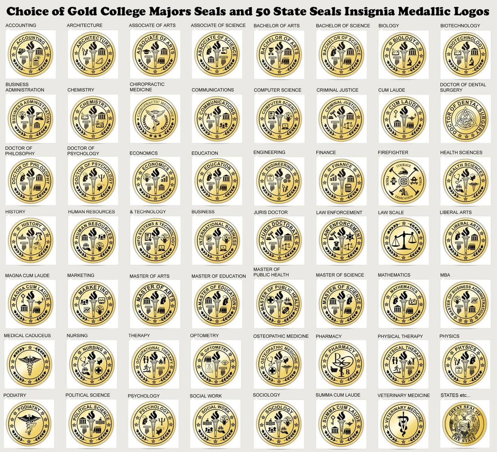 Accounting, Architecture, Associate of Arts, Associate of Science, Bachelor of Arts, Bachelor of Science, Biology, Biotechnology, Business Administration, Chemistry, Chiropractic Medicine, Communications, Computer Science, Criminal Justice, Cum Laude, Doctor of Dental Surgery DDS, Doctor of Dental Medicine DMD, Doctor of Optometry OD, Doctor of Education, Doctor of Medicine MD, Doctor of Pharmacy Pharm D., Doctor of Philosophy PHD, Doctor of Psychology PsyD, Economics Education, Engineering, Finance, Firefighter, Health Sciences, History, Human Resources, Info System & Technology, International Business Juris Doctor, Law Enforcement, Law Scale, Liberal Arts, Magna Cum Laude Marketing, Master of Arts, Master of Education, Master of Public Health Master of Science, Mathematics, MBA, Medical, Nursing, Nurse Practitioner, Occupational Therapy, Optometry, Osteopathic Medicine DO, Pharmacy, Physical Therapy, Physics Podiatry, Political Science, Psychology, Registered Nurse, Social Work, Sociology Summa Cum Laude, Veterinary Medicine