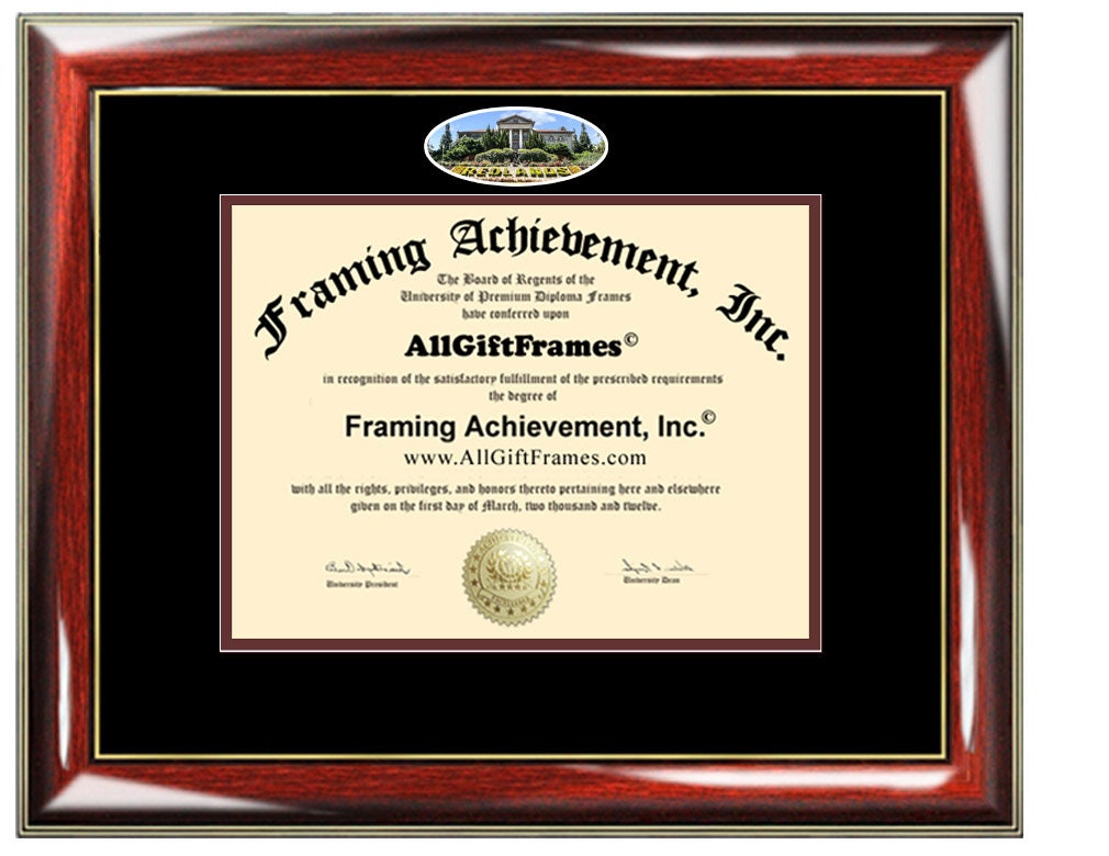 Low cost quality University of Redlands degree frames and certificate frames using state-of-the-art quality control techniques to display achievement. Selling a variety of deluxe wood custom college university diploma frames with campus picture. All certificate frames are custom made to fit your diploma document sizes. Wholesaler of custom degree frames and certificate frames with premium wood mouldings and plaque frames. These university diploma plaques will display and enhance your success and will make a great wall decor.